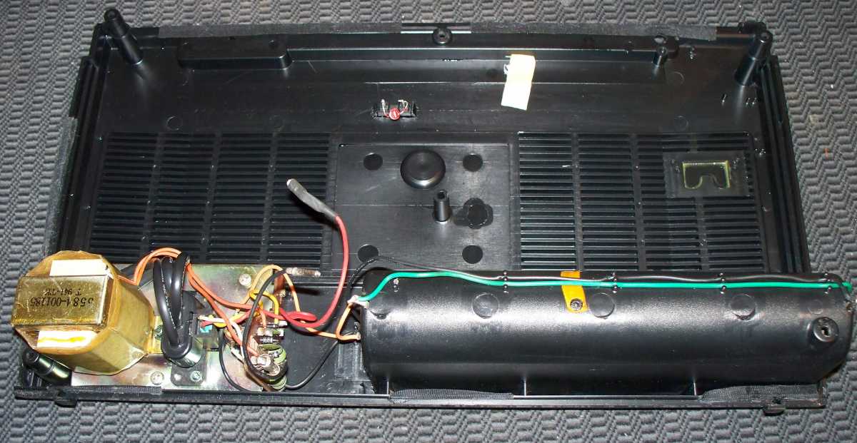 Ну и начну свой обзор с неё, то бишь с крышки. На ней остаётся трансформатор, размеров правда не больших, но тяжёлый. Он обмотан в пропитанную лаком бумагу, рядом плата выпрямителя. С основной платой он соединяется двумя проводами на разъёмах, они единственные в этой магнитоле таковы. Ах нет ещё провод с антенны.
