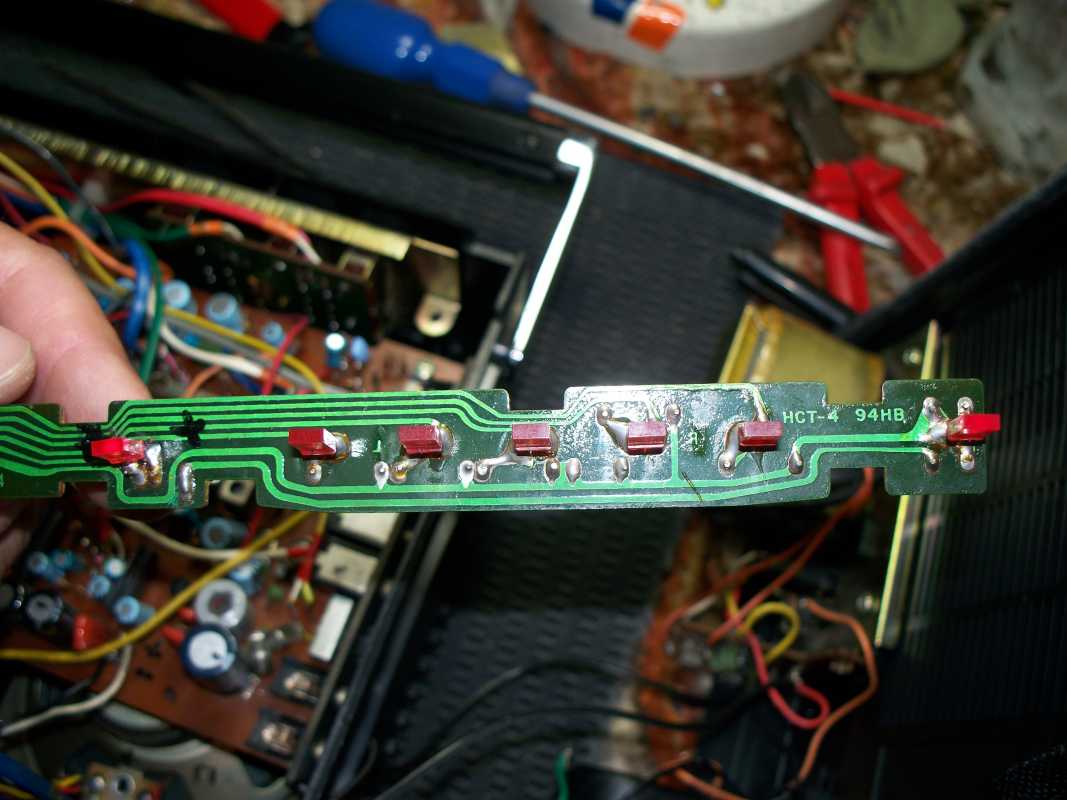 Следующее над чем мне пришлось изрядно повозиться, даже несколько раз доставать всю начинку, это светодиод FM стерео. Мелочь, но не приятная. Светодиод был заменён на другой, так как старый работать отказывался. Но после непродолжительной работы, он начинал мигать и тухнуть. Не буду описывать весь процесс замеров, контроля и т.д., скажу лишь одно, всегда хорошо нужно пропаивать детали, которые меняешь. В конце концов, всё закончилось моей победой.