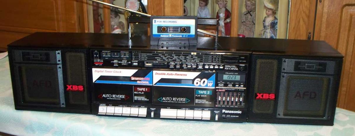 Одним из самых удачных аппаратов выпущенных в 1987 году была магнитола Panasonic RX-CW 55 L. Главной её фишкой является система XBS (Extra bass System), при включении этой функции магнитола не просто играет, она выдаёт очень качественные низы, и при всём этом звуковой тракт работает без перегрузок. Так же в наборе функций имеется 5 полосный эквалайзер, часы-таймер, линейный вход. Размеры 725x163x188 мм, вес 6 кг.