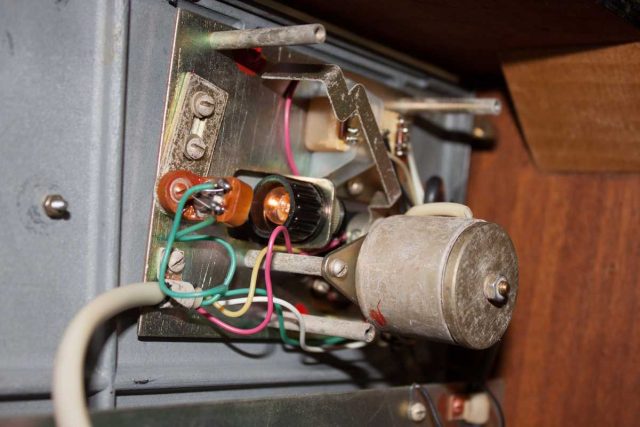 Более тщательный осмотр, (а это занятие не совсем простое, 20-ти килограммовый аппарат, толстое цельно-литое шасси, ставишь боком, стоять не хочет, годы все таки нарушили геометрию деревянного корпуса, так и норовит упасть), показал, родной предохранитель до наших дней не дожил. После замены, о чудо, загорелась лампа стробоскопа и мотор заработал. Это обрадовало несказанно.