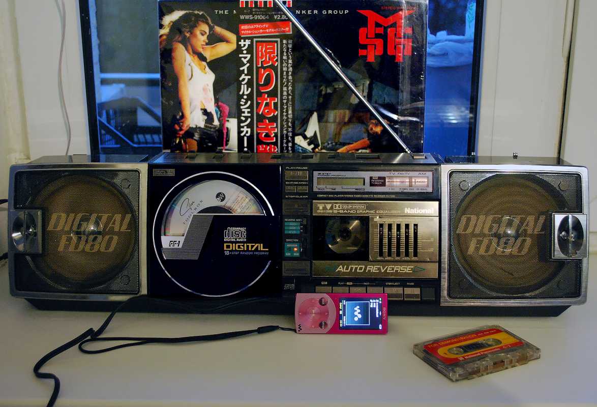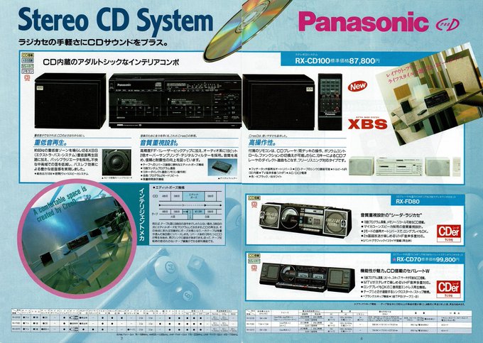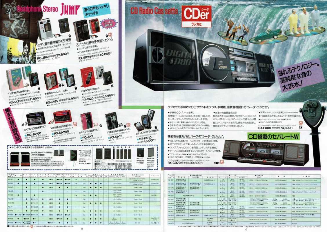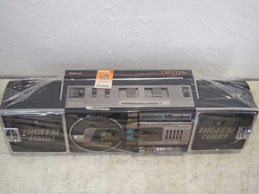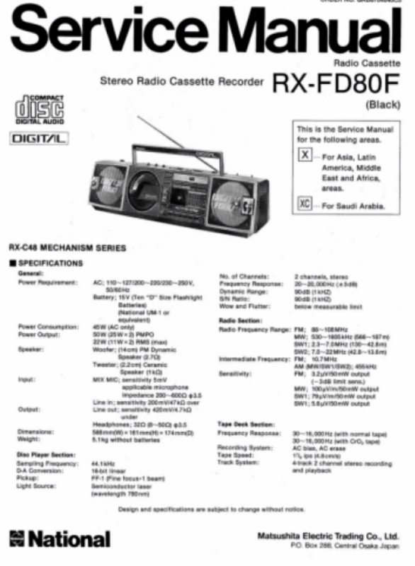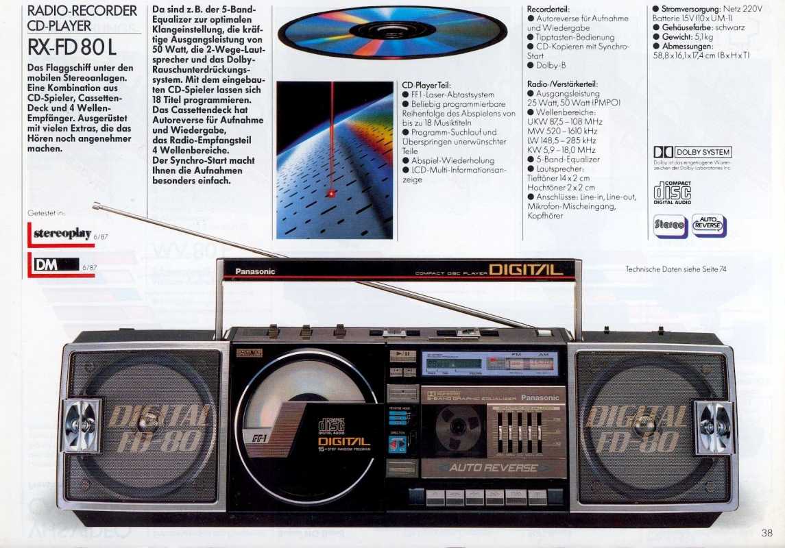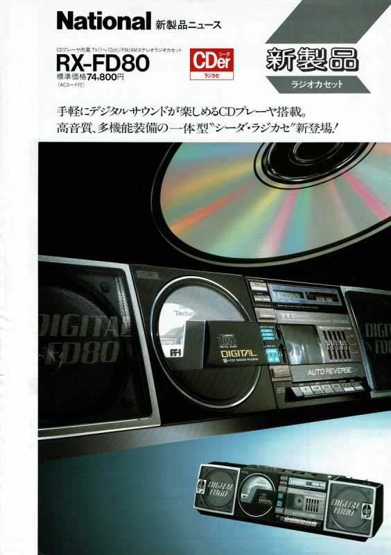 На дворе стоял далекий 1987 год. Японский концерт Matsushita основательно подготовился к переходу своей продукции портативного радио на новый музыкальный формат - СD. Открываются новые горизонты в безграничном качестве звучания, которое обеспечит лазерное чудо. Будущее здесь и сейчас. Вставил диск и фантастика уже у вас в доме. Под брендами Panasonic и National выпущен первенец компании RX-FD80, позволивший прикоснуться покупателю к новому, наберающему популярность, цифровому формату. Возьмем в руки фирменный каталог тех лет. FD80 здесь смотрит на нас прямо с обложки. Открываем следующую страничку. Мегахит без лет, двухкассетный со спектроанализатором CW200 и тот смещен в каталоге на позицию ниже этого суперсовременного лазерного монстра. То есть RX-FD80 - тот самый топ, на который возложены огромные надежды и строится маркетинг мирового японского гиганта. Эдакая первая ласточка грядущей новой эры. Купил эту штуковину не имея ни малейшего представления что это за аппарат. Просто захотелось заполучить магнитолку с сидюком. Приобрел в Японии, имея приятеля на Сахалине. Аппаратик контрабандой доставили моряки вместе парочкой из верхних постов. Попросту прихватили с собой лишний багаж в японском порту. Приехал магнитофоне в Беларусь. Честно говоря, брал аппарат понравившимся по картинке и думал что получу небольшой батончик. Куда там. Приезжает тяжелая, почти шестикилограммовая длиннющая магнитола с лопухами 14 см динамиков из белой рисовой бумаги. Подключить и послушать шансов никаких. В этой модели не предусмотрено питание через блок питания или через автомобильный шнур. Только сетевой на 100вольт. Ну раз такое дело, попробовал проверить магнитолу через ... блок питания, припаяв в пружинам батарейного отсека. Магнитола тут же включалась и тут же звук пропал. Мощности внешнего трансформатора не хватило. Аппарат жадно из него всё высосал. Ещё бы. Мощность то якобы 50W PMPO. Естественно, первое что необходимо сделать с этим пациентом - заменить трансформатор на 220 вольт. Япончик к тому же выдавал 13,5V. Как раз аналог у меня уже был. Магнитола включилась и довольно хорошо запела. Без каких либо особых приукрас она чудным образом отрабатывает тот звуковой сигнал, который поступает. А именно, магнитофон тех тет, где производитель не сэкономили практически ни на чем, кроме, видимо вышедших из моды светодиодных или стрелочных индикаторов. Но и без них тут фарша в лучших котлетах столько не найти. Первое, собственно, это сам CD с вертикальной загрузкой. Смотрится богато. Это потом диск спрячется в магнитолах куда нибудь наверх корпуса. А тут он на виду. Особое внимание уделюименно этой опции. У магнитолы богатая функция использования этого самого CD. ЖК дисплей. Возможность повтора, рэндом и поиск на 18 треков, память. Понятное дело что у магнитолы второй носитель - компакт кассета. Так вот: здесь предусмотрен синхростарт CD для перезаписи на пленку. Удобно? Конечно. Теперь о самой кассетной части. Смотрим на подкассетник. Прямо на передней его панели 5 полосный эквалайзер. Ну куда же без автореверса. Слева от подкассетника рычажок переключения положения головки, которая при этом проворачивается пластиковой шестеренкой. Такая же лентопротяжка в свое время устанавливалась в нашу советскую Вегу 250-2 . Два вала. Два маленьких ролика. Большая кондовая лентопротяжка. Слава богу о