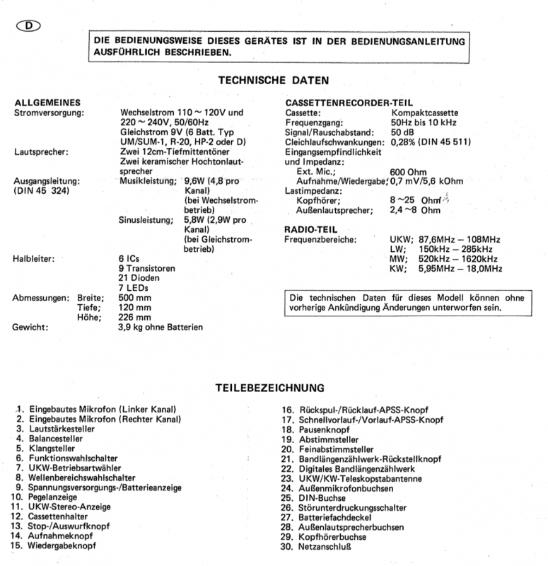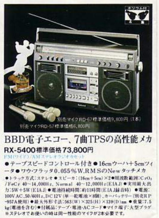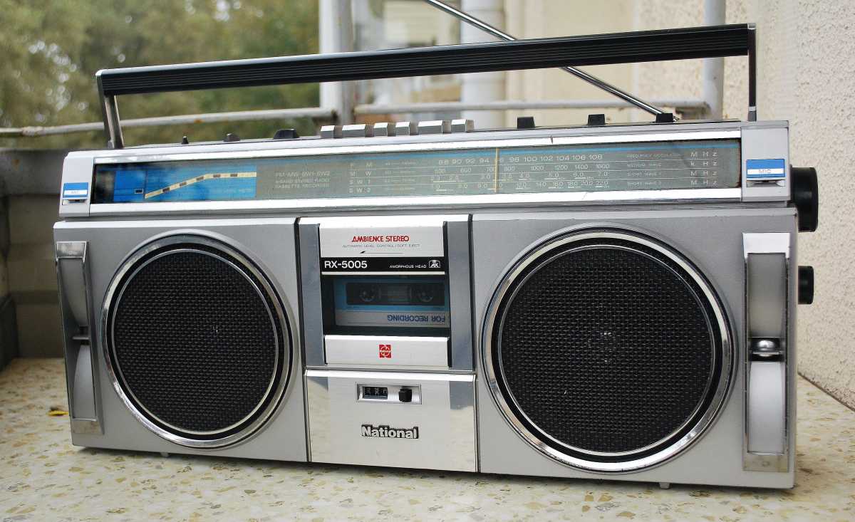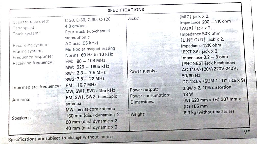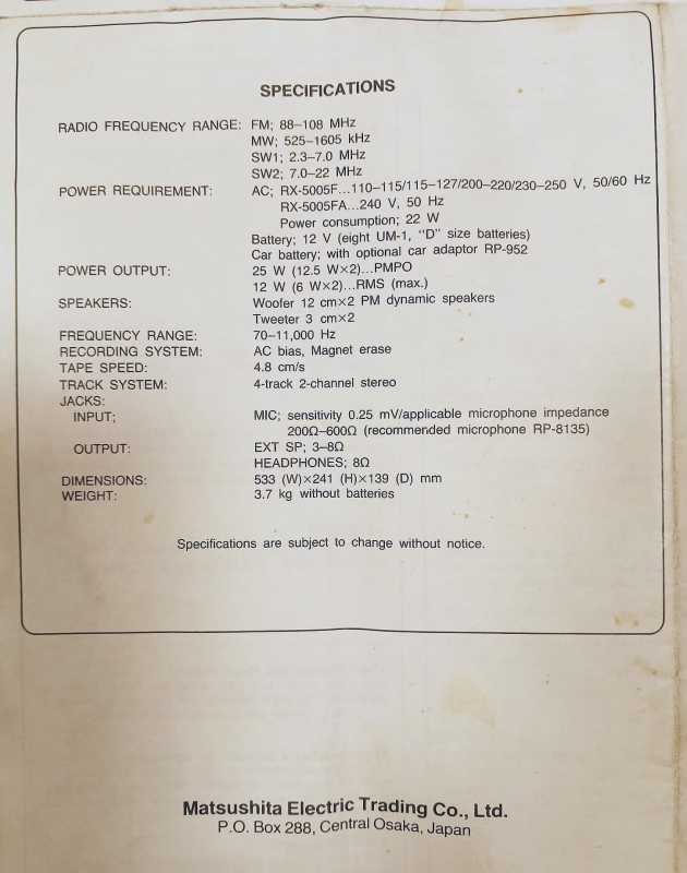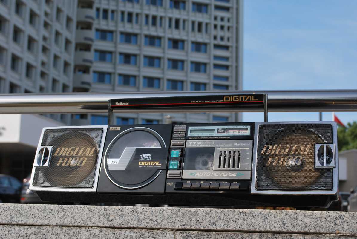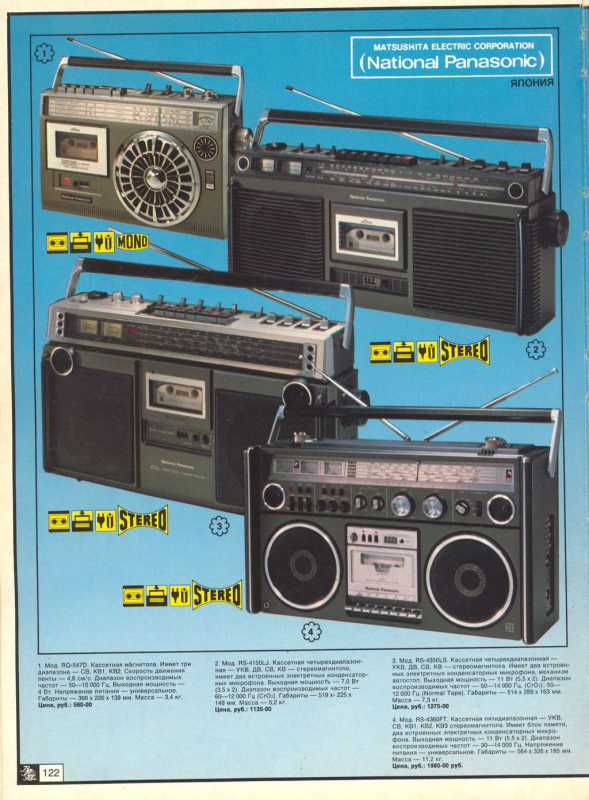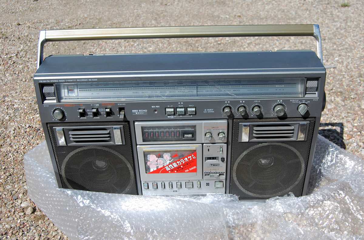 На дворе стоял далекий 1987 год. Японский концерт Matsushita основательно подготовился к переходу своей продукции портативного радио на новый музыкальный формат - СD. Открываются новые горизонты в безграничном качестве звучания, которое обеспечит лазерное чудо. Будущее здесь и сейчас. Вставил диск и фантастика уже у вас в доме. Под брендами Panasonic и National выпущен первенец компании RX-FD80, позволивший прикоснуться покупателю к новому, наберающему популярность, цифровому формату. Возьмем в руки фирменный каталог тех лет. FD80 здесь смотрит на нас прямо с обложки. Открываем следующую страничку. Мегахит без лет, двухкассетный со спектроанализатором CW200 и тот смещен в каталоге на позицию ниже этого суперсовременного лазерного монстра. То есть RX-FD80 - тот самый топ, на который возложены огромные надежды и строится маркетинг мирового японского гиганта. Эдакая первая ласточка грядущей новой эры. Купил эту штуковину не имея ни малейшего представления что это за аппарат. Просто захотелось заполучить магнитолку с сидюком. Приобрел в Японии, имея приятеля на Сахалине. Аппаратик контрабандой доставили моряки вместе парочкой из верхних постов. Попросту прихватили с собой лишний багаж в японском порту. Приехал магнитофоне в Беларусь. Честно говоря, брал аппарат понравившимся по картинке и думал что получу небольшой батончик. Куда там. Приезжает тяжелая, почти шестикилограммовая длиннющая магнитола с лопухами 14 см динамиков из белой рисовой бумаги. Подключить и послушать шансов никаких. В этой модели не предусмотрено питание через блок питания или через автомобильный шнур. Только сетевой на 100вольт. Ну раз такое дело, попробовал проверить магнитолу через ... блок питания, припаяв в пружинам батарейного отсека. Магнитола тут же включалась и тут же звук пропал. Мощности внешнего трансформатора не хватило. Аппарат жадно из него всё высосал. Ещё бы. Мощность то якобы 50W PMPO. Естественно, первое что необходимо сделать с этим пациентом - заменить трансформатор на 220 вольт. Япончик к тому же выдавал 13,5V. Как раз аналог у меня уже был. Магнитола включилась и довольно хорошо запела. Без каких либо особых приукрас она чудным образом отрабатывает тот звуковой сигнал, который поступает. А именно, магнитофон тех тет, где производитель не сэкономили практически ни на чем, кроме, видимо вышедших из моды светодиодных или стрелочных индикаторов. Но и без них тут фарша в лучших котлетах столько не найти. Первое, собственно, это сам CD с вертикальной загрузкой. Смотрится богато. Это потом диск спрячется в магнитолах куда нибудь наверх корпуса. А тут он на виду. Особое внимание уделюименно этой опции. У магнитолы богатая функция использования этого самого CD. ЖК дисплей. Возможность повтора, рэндом и поиск на 18 треков, память. Понятное дело что у магнитолы второй носитель - компакт кассета. Так вот: здесь предусмотрен синхростарт CD для перезаписи на пленку. Удобно? Конечно. Теперь о самой кассетной части. Смотрим на подкассетник. Прямо на передней его панели 5 полосный эквалайзер. Ну куда же без автореверса. Слева от подкассетника рычажок переключения положения головки, которая при этом проворачивается пластиковой шестеренкой. Такая же лентопротяжка в свое время устанавливалась в нашу советскую Вегу 250-2 . Два вала. Два маленьких ролика. Большая кондовая лентопротяжка. Слава богу о