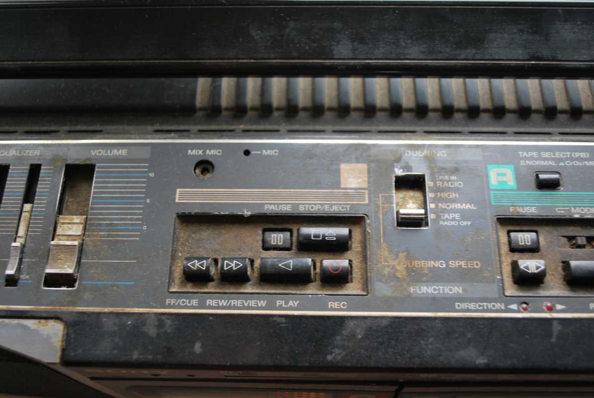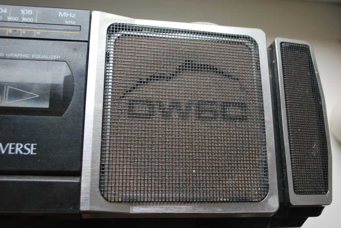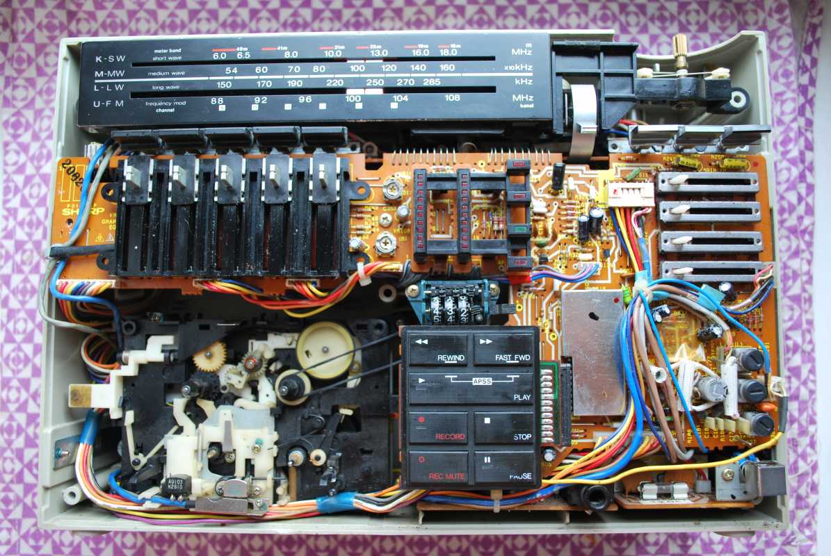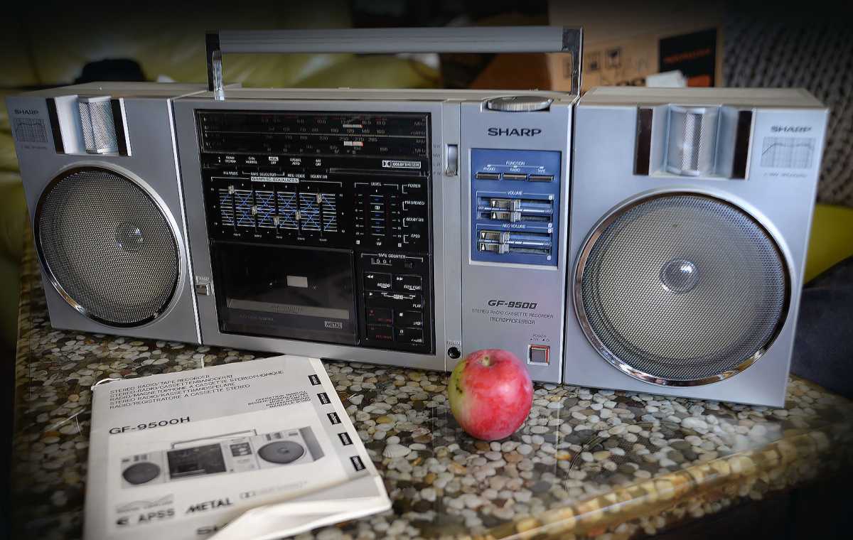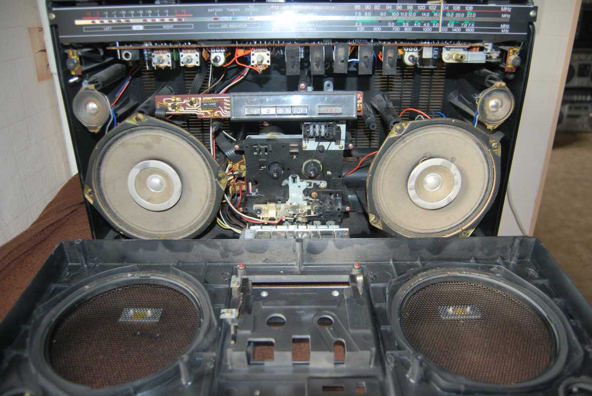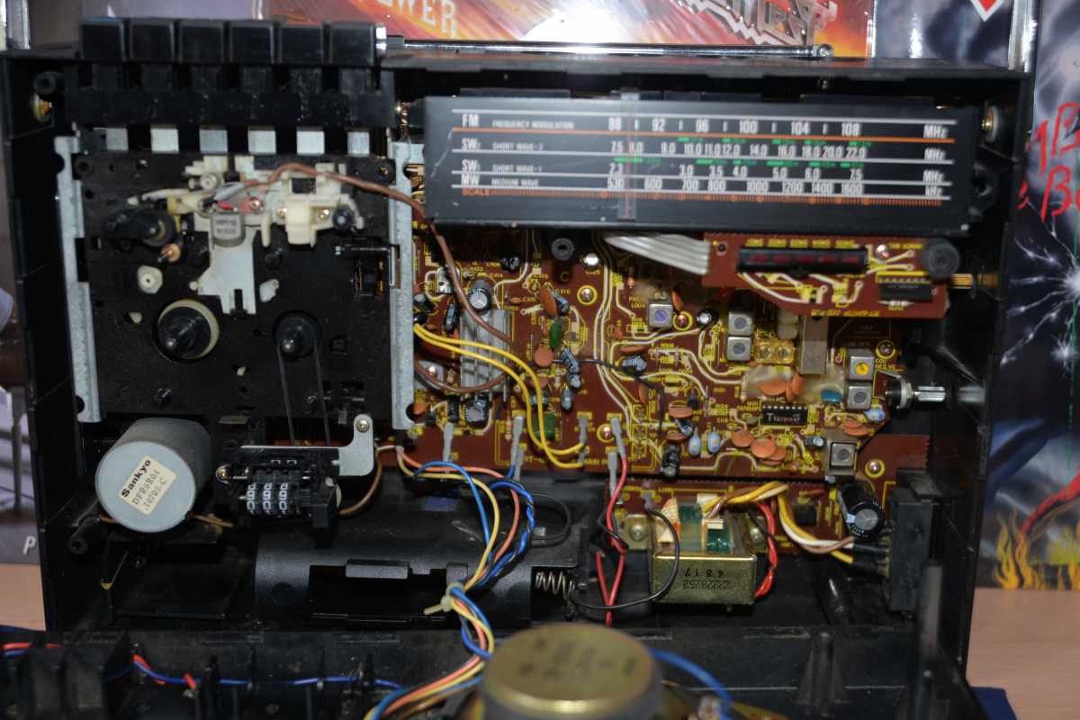 О существовании этой магнитолы у моего соседа я знал лет двадцать пять. И кроме как у него больше ни у кого не видел. Андрюха - известный в Беларуси барабанщик, еще с тех времен когда страна имела на мой взгляд более красивое и уютное название Белоруссия. (Беларусь для меня - эпоха АГЛ) Фил, или официально, Андрей Филатов барабанил в самой первой белорусской рок-группе "Сузорье", а позже, уже в "Крама". В 80-е он приобрел в Германии свой магнитофон, на котором даже были записаны некоторые песни "Сузорья". В лихие 90-е у соседа был период, когда он открыл на бульваре Толбухина небольшую студию звукозаписи рядом с "Каменным цветком" и магнитола SHARP помогала ему в записи с винила, вертушки "Электроника 017". Там, видать магнитофону и досталось потрудиться, несмотря на бережные руки хозяина. Лет десять назад меня подкосило странное увлечение коллекционирования ставших уже историей, японских магнитол, а в год короновируса и политических катаклизмов зашел к Андрею в гости. Накануне он перенес сложную операцию шунтирования на сердце. Я зашел справиться о здоровье. А получился спонтанный видеосюжет. Прощаясь, Филатов вдруг предложил найти покупателя на его магнитолу, которая к тому времени долго и бережно хранилась на антресолях в родной упаковке, видимо занимая место. Честно, я даже не помышлял о приобретении этого аппарата, бо не коллекционирую магнитолы где колонки отстегиваются от корпуса. Но в данном случае - исторический коробочный экземпляр с документами и автографом владельца. Я не торгуясь его приобрел за красивые деньги, которые сегодня Андрюхе нужны. После такой операции теперь не побарабанишь. И вот у меня дома теперь еще одним ящиком больше. Огромный впечатляющий аппарат. Крепление колонок интересной конструкции нужно было немного отремонтировать, разобрав корпус самого системного блока магнитолы. Теперь оно абсолютно надежно зафиксировано. Колонки с виду похожи на GF700. Те же самые катушки провода, которые немного выезжают и фиксируются при его сматывании. Те же динамики, но в середине катушек есть отверстия подобия небольшого фазоинвертора, чего нет в семисотом. Сама магнитола выпуска 1982 года и предполагая что же первично яйца или курица, уклоняюсь к народному мнению что GF9500 - модель, которая появилась раньше своего двухкассетного и брата GF700. ЛПМ у андрюхиного 9500 на данный момент молчалив. С моих первых попыток его оживить и сейчас в том же состоянии. Кнопки все включаются. Соленойды срабатывают, но вот двигатель молчит. И эта неисправность, судя по стонам в интернете, довольно популярна у этого аппарата. Слишком уж намудрили японцы с электронным управлением. Лентопротяжка у GF9500 отличается от softtouch GF700 не только кнопками у второго и панелькой управления у первого но и двумя соленойдами у магнитолы рок-звезды. Внутрення конструкция магнитолы уже не создаёт впечатления брутальности, как например у GF9696/9595/9797. Тут нет изобилия металла. Здесь много пластика. Раскрыв корпус, мы видим как вываливается один блок из другого. Да собирать на японском заводе побочно и фиксировать всё винтами, закрутив заднюю крышку видимо было технологично и удобно. Но как то уж революционно изменись технологии сборки за один год в компании SHARP. Жгуты проводов стали покороче, что в этом магнитофоне привело к обрыву нескольких при вскрывании, что удалось легк