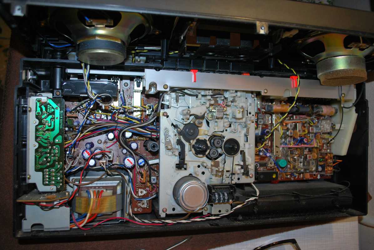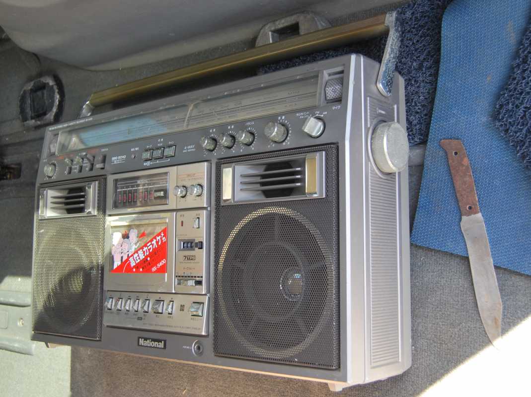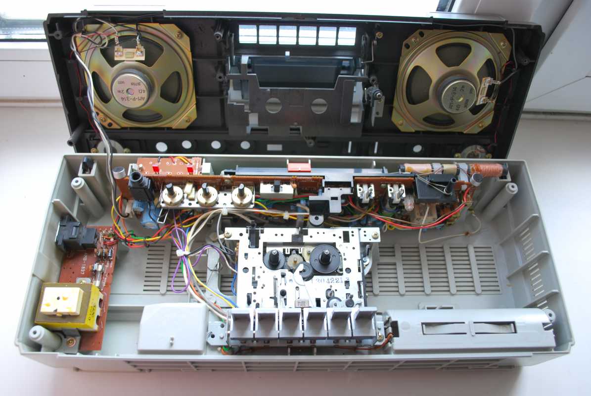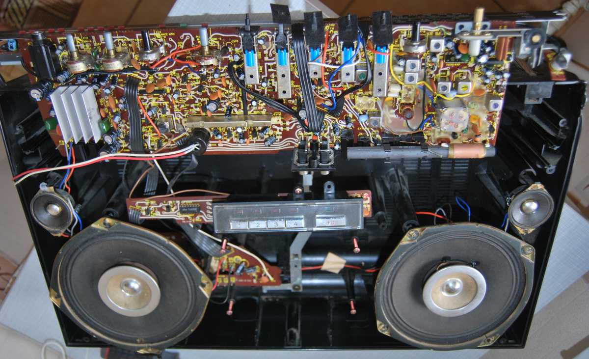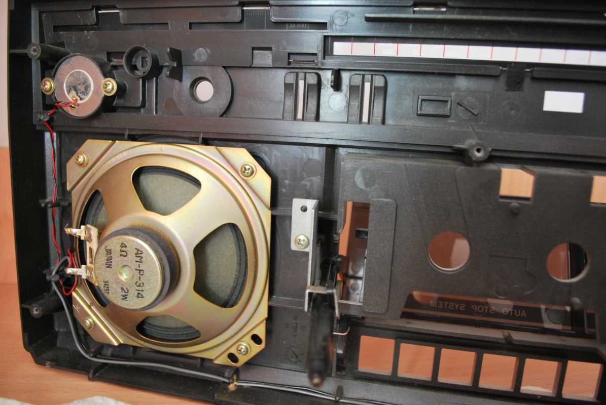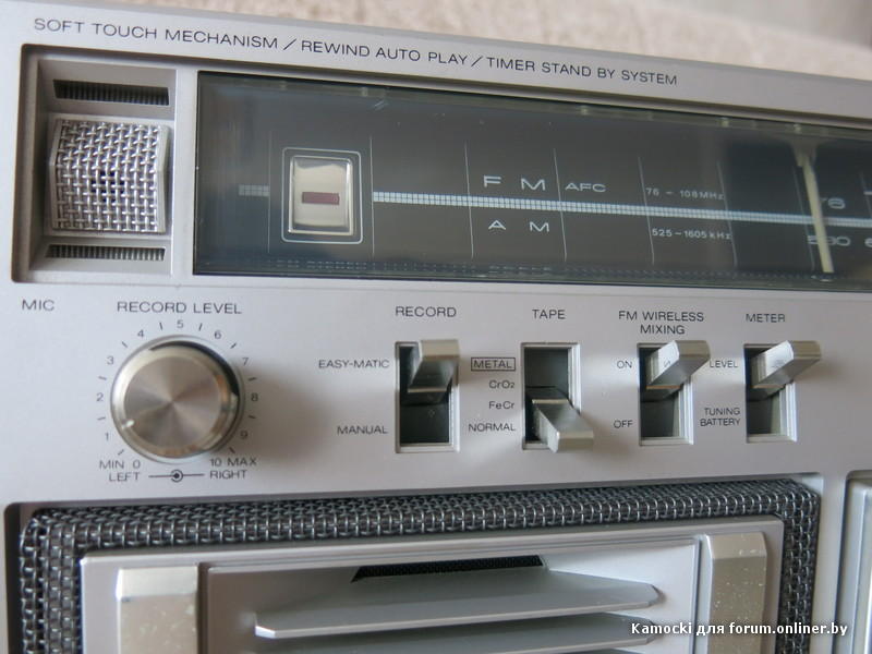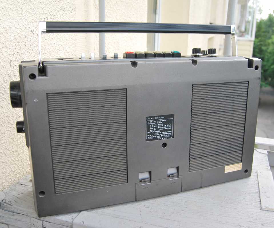 Следующее приобретение было весьма спонтанным. Была возможность купить и привезти магнитолу с Японии и я этим шансом воспользовался. Залез на японский аукцион, а тут на последнем часу скучает необычная для наших мест магнитола. Нажатие кнопки раньше, чем кто-то другой сообразил и старенький магнитофон отправился из префектуры Сайтама, что рядом с Токио, прямиком на пароход. Через неделю был уже на Сахалине и всей кучей прочих японских нештяков - японским виски, винилом и прочим скарбом отбыл на большую землю и чудом успел кораблем в Хабаровск, когда начался сентябрьский тайфун. Ну а там и Беларусь недалеко. Приезжает значит он, ко мне вместе с тремя ящиками всякой японской всячины. Открываю, и обомлел. Магнитолу японец засунул в обычный картонный ящик абсолютно ничем не обернув, кроме одного слоя полиэтилена. И при этом все цело и невредимо. Достаю. Чумазый причумазый. На хроме следы окислов. Тер-тер всякими мульсиями. Хоть бы хны. Смотрю, на подоконнике стерка школьная лежит. Прошелся несколько раз. Окислы смыло. Не зря в армии электроконтакты на танках так чистили. Милое дело. В батарейном отсеке родной шнур. 100v! Подключил 12вольтовым блоком питания с минусом на жиле, этой же фирмы, купленным летом в Одессе. Прикольно. Кассета работает. Радио ловится. Красота. В подкассетнке собачья или кошачья шерсть войлоком. Но зато все поет. Шуршат все крутилки, зато система поиска песен работает. Интересный тяжелый аппаратик. Слава богу повезло с мордой алюминия. Коррозии, которая бывает практически и не заметно. Голова на аппарате MX. Кассеты тестовые C-30 у меня на этот аппарат аж в двойном количестве. Полез вовнутрь, все как и положено в огромной магнитоле конца 70-х. Большая массивная лентопротяжка с чудными закидонами, видимо реализации программы поиска. Когда она включена в режиме поиска на кассете, некоторые другие функции не включатся, пока не отключить саму программу поиска. Не просто, кондово, много металла и некоторых новых для меня элементов. Кругом жгуты, но и планки разъемов тоже присутствуют. Японский транс в закрытом корпусе и от него идут два провода. Большие 16 сантиметровые динамики. 5см пищалки. Шикарный аппарат, который держать в руках и смотреть живьем куда интереснее чем на картинках из интернета. Деревянный кабинет на самом деле пластик. Смотрится офигенно. И слава богу это не дерево. Возни бы с лаками было бы куда больше с сорокалетней магнитолой. Голова MX. Cтеклоферрит. Как ни крути, 1978 год а она как новая. В отличии от SONY CFS-85 с таким же "деревянным" кабинетом, тут стирающая голова настоящая а не магнитик. С переделкой магнитолы на трансформатор 220v у меня состоялась забавная и довольно затянувшаяся на пару лет история. Установил, стоит гул. Что я только не делал. Может провода рядом с трансом? Крутил-вертел, не помогает. Экраны? Тоже нет. Плюнул, отпаял новый трансформатор, растопил свечек и погрузил в расплавленный стеарин. В течении пары минут из "утопленника" потянулись редкие пузырьки воздуха, покидающие зазоры пластин. Припаял обратно транс. Результат - потише но все равно гудит. Корпус магнитолы впадает в резонанс с трансформатором. Взял резиновый шланг от топливного мотонасоса диаметром в 5мм и нарезал колец высотой по миллиметра 3. Установил площадку крепления трансформатора на "подушки" и затянул прижимные винты. Заметный г