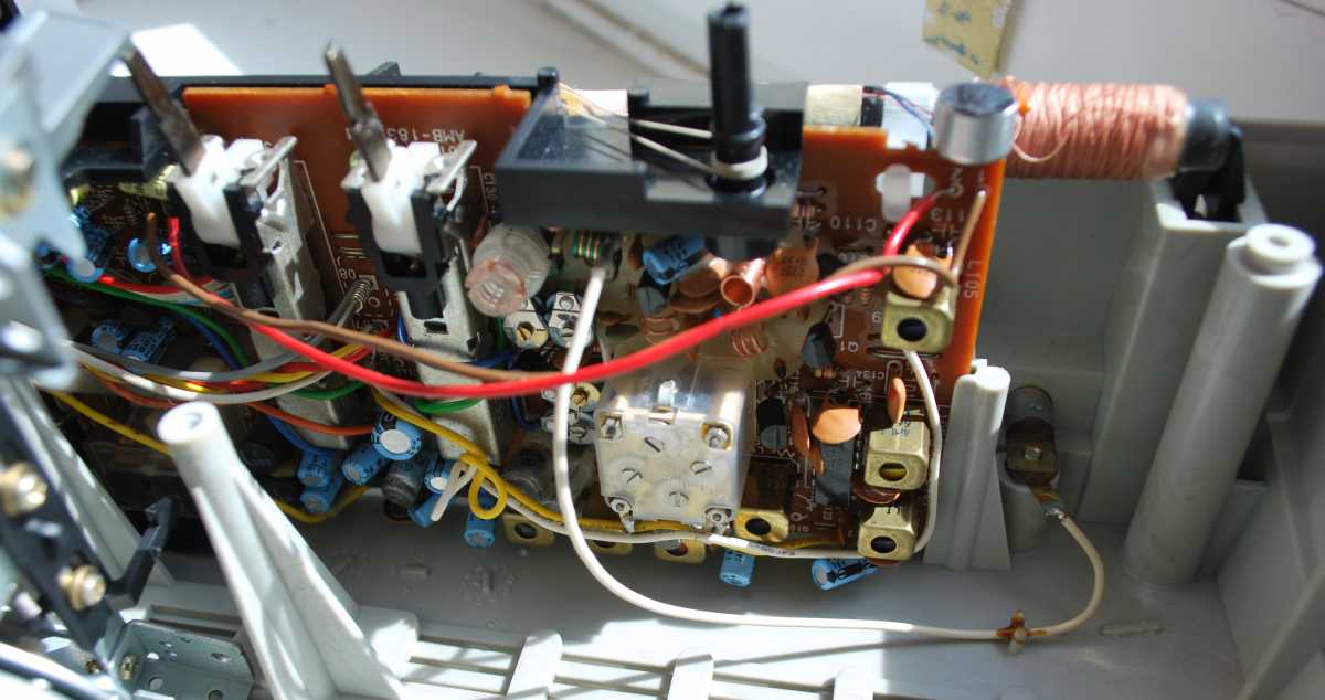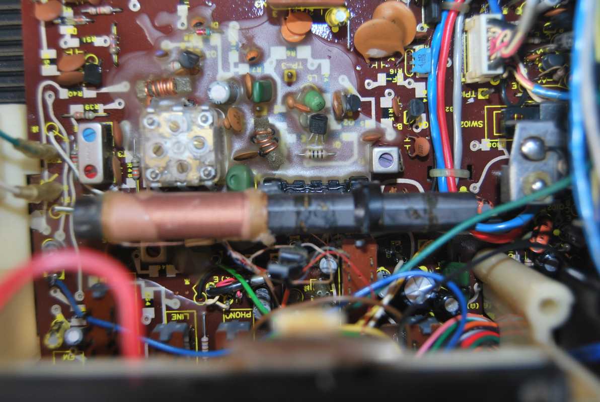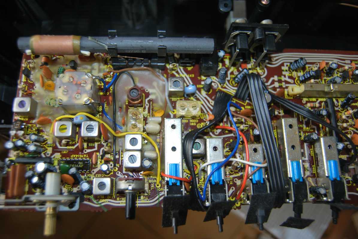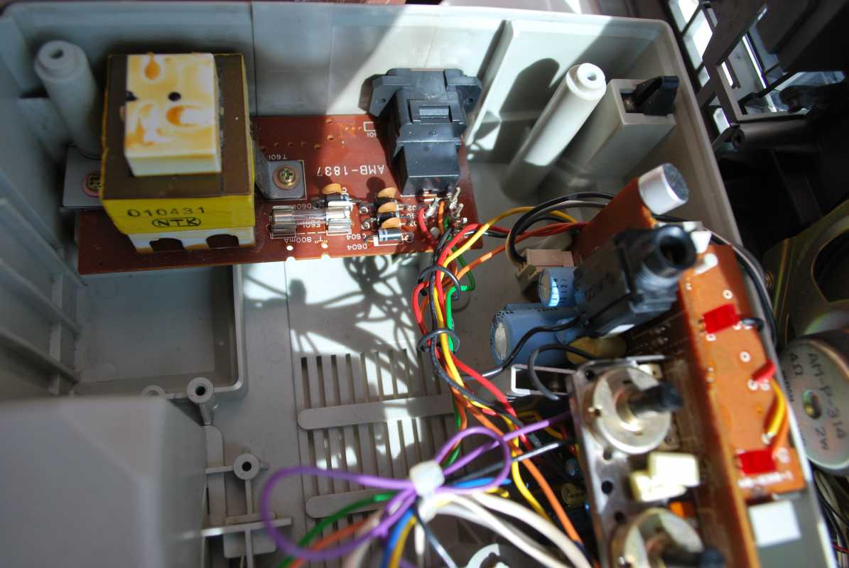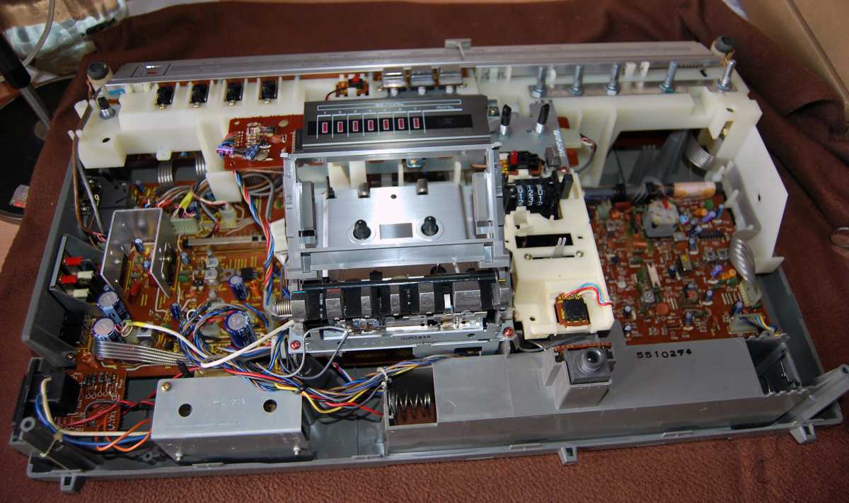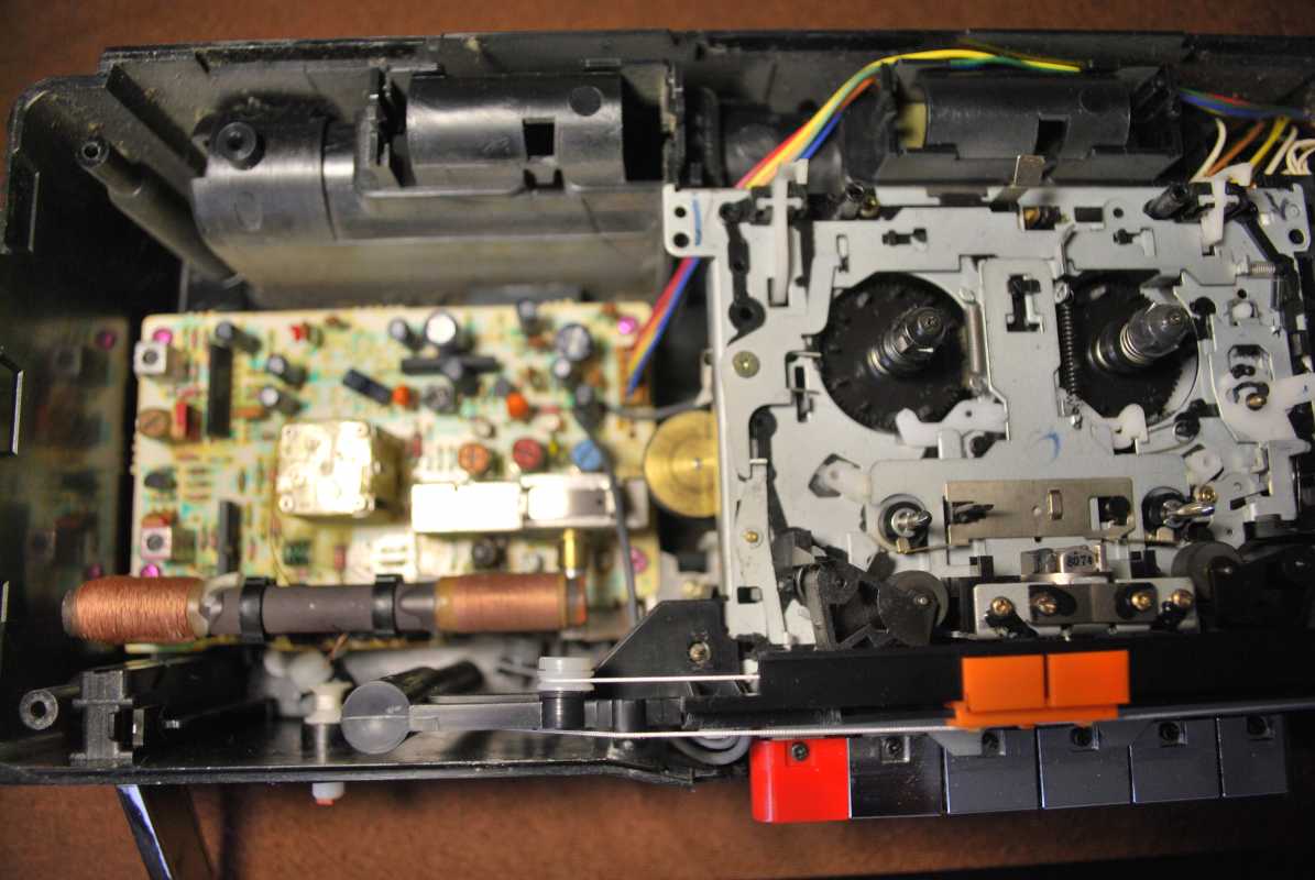 Следующее приобретение было весьма спонтанным. Была возможность купить и привезти магнитолу с Японии и я этим шансом воспользовался. Залез на японский аукцион, а тут на последнем часу скучает необычная для наших мест магнитола. Нажатие кнопки раньше, чем кто-то другой сообразил и старенький магнитофон отправился из префектуры Сайтама, что рядом с Токио, прямиком на пароход. Через неделю был уже на Сахалине и всей кучей прочих японских нештяков - японским виски, винилом и прочим скарбом отбыл на большую землю и чудом успел кораблем в Хабаровск, когда начался сентябрьский тайфун. Ну а там и Беларусь недалеко. Приезжает значит он, ко мне вместе с тремя ящиками всякой японской всячины. Открываю, и обомлел. Магнитолу японец засунул в обычный картонный ящик абсолютно ничем не обернув, кроме одного слоя полиэтилена. И при этом все цело и невредимо. Достаю. Чумазый причумазый. На хроме следы окислов. Тер-тер всякими мульсиями. Хоть бы хны. Смотрю, на подоконнике стерка школьная лежит. Прошелся несколько раз. Окислы смыло. Не зря в армии электроконтакты на танках так чистили. Милое дело. В батарейном отсеке родной шнур. 100v! Подключил 12вольтовым блоком питания с минусом на жиле, этой же фирмы, купленным летом в Одессе. Прикольно. Кассета работает. Радио ловится. Красота. В подкассетнке собачья или кошачья шерсть войлоком. Но зато все поет. Шуршат все крутилки, зато система поиска песен работает. Интересный тяжелый аппаратик. Слава богу повезло с мордой алюминия. Коррозии, которая бывает практически и не заметно. Голова на аппарате MX. Кассеты тестовые C-30 у меня на этот аппарат аж в двойном количестве. Полез вовнутрь, все как и положено в огромной магнитоле конца 70-х. Большая массивная лентопротяжка с чудными закидонами, видимо реализации программы поиска. Когда она включена в режиме поиска на кассете, некоторые другие функции не включатся, пока не отключить саму программу поиска. Не просто, кондово, много металла и некоторых новых для меня элементов. Кругом жгуты, но и планки разъемов тоже присутствуют. Японский транс в закрытом корпусе и от него идут два провода. Большие 16 сантиметровые динамики. 5см пищалки. Шикарный аппарат, который держать в руках и смотреть живьем куда интереснее чем на картинках из интернета. Деревянный кабинет на самом деле пластик. Смотрится офигенно. И слава богу это не дерево. Возни бы с лаками было бы куда больше с сорокалетней магнитолой. Голова MX. Cтеклоферрит. Как ни крути, 1978 год а она как новая. В отличии от SONY CFS-85 с таким же "деревянным" кабинетом, тут стирающая голова настоящая а не магнитик. С переделкой магнитолы на трансформатор 220v у меня состоялась забавная и довольно затянувшаяся на пару лет история. Установил, стоит гул. Что я только не делал. Может провода рядом с трансом? Крутил-вертел, не помогает. Экраны? Тоже нет. Плюнул, отпаял новый трансформатор, растопил свечек и погрузил в расплавленный стеарин. В течении пары минут из "утопленника" потянулись редкие пузырьки воздуха, покидающие зазоры пластин. Припаял обратно транс. Результат - потише но все равно гудит. Корпус магнитолы впадает в резонанс с трансформатором. Взял резиновый шланг от топливного мотонасоса диаметром в 5мм и нарезал колец высотой по миллиметра 3. Установил площадку крепления трансформатора на "подушки" и затянул прижимные винты. Заметный г