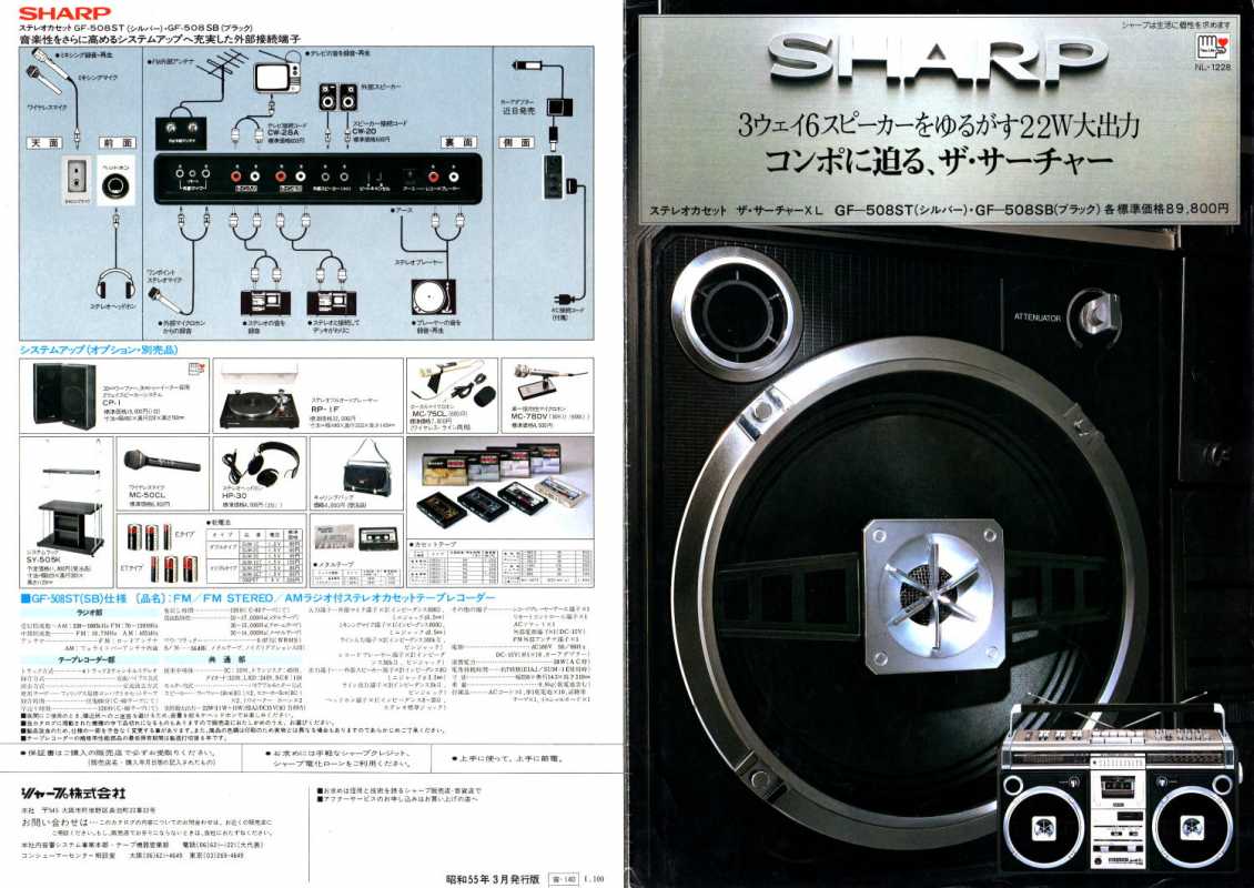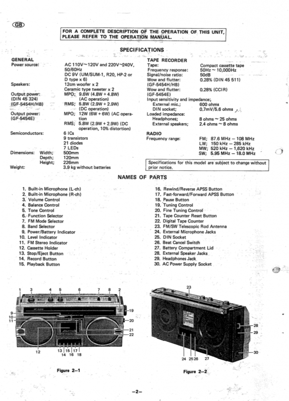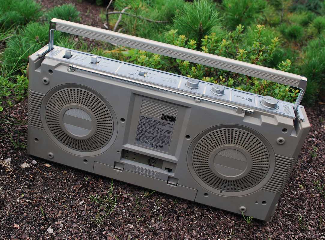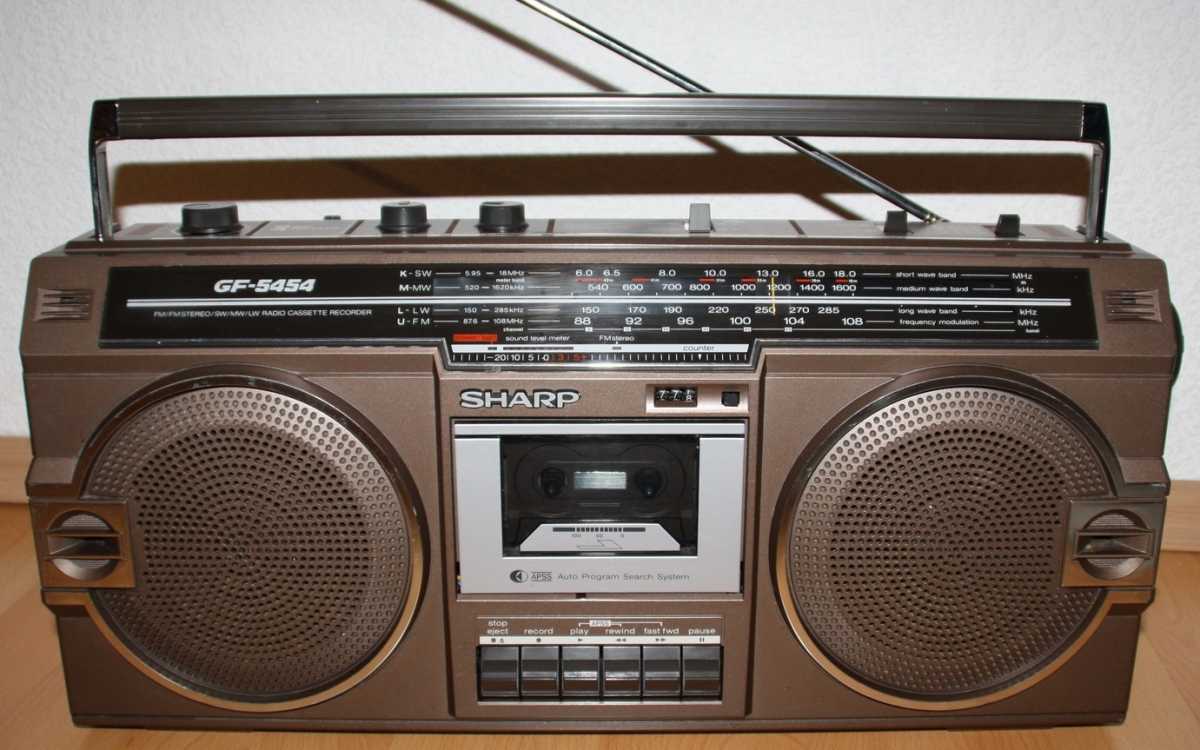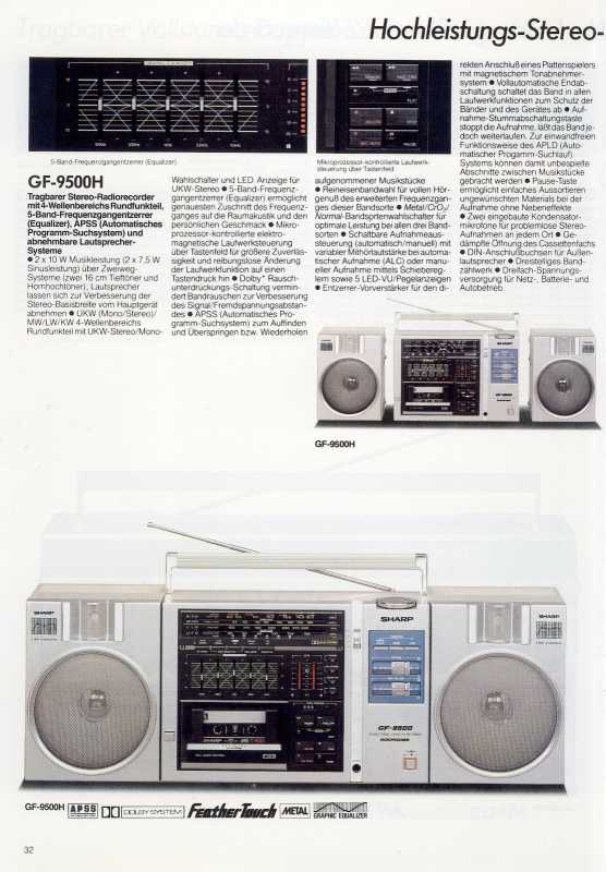 SHARP GF-5454 сначала я почти год ходил глотал слюни на улицу Карла Маркса, где в Минске находилась комиссионка японских магнитофонов. Потом мы с отцом взяли некислую сумму рублей СССР и отправились делать покупку. Приходим. Уже готовы брать именно такой магнитофон, как к нам подходит какой-то спекулянт и предлагает за ту же сумму что и в комиссионке, новенькую, в коробке, но немного другую модель. Короче, я не стал обладателем GF-5454. Уж очень он мне нравился. Зато по случаю таки я заполучил этот аппаратик и он стоит в моем шкафу. Теперь собственно о самом SHARP GF-5454. Можно смело назвать этот удачный аппарат одним из самых массовых. С огромным воодушевлением везли его со всего мира в СССР чернокожие обитатели советских общаг с целью перепродажи. Стоил недорого. Зато какой подъем! 1200 советских рублей. 5 месячных зарплат лейтенанта ВС. Если рассматривал его конструкцию, то она основана на популярных 12см динамиках, которые мы встретим и в более младших GF-4646 и в более раннем GF-6060/6161, более позднем GF-7500/7600 и в двухкассетных GF-450/500. Но на мой взгляд именно этот магнитофон являл золотую середину. Достаточно широкий аппарат более 50см. Наличие красивого свтодиодного индикатора, только входившего тогда в моду. Больше всего модель портил АРУЗ - автоматическая регулировка уровня записи. Писать на этот магнитофон с внешнего источника было истязанием. Лучше было это сделать на чем-то другом и на шаре только воспроизводить. Зато в наше время это уже не важно. Шикарный, цепкий радиоприемник великолепно ловил вражьи голоса. А как 5454 сегодня отрабатывает прием FM! Жаль в те времена послушать этот стереодиапазон было не возможно в СССР. Магнитола на мой взгляд является ярким и удачным образцом классического яркого дизайна своего времени. Легка в ремонте и разборе. Пьезопищалки... они присущи большинству магнитол той поры. В аппарат так и просилась раздельная регулировка диапазонов. Конструкционно она была заложена, но ее реализовать не спешили. Выпускался аппаратик в двух цветах - в серебре и кофе с молоком. Шкала могла быть голубой или черной. А вот аналогичная модель для рынка Японии отличалась блестящими хромированными кнопками. ТЕХНИЧЕСКИЕ ХАРАКТЕРИСТИКИ Принимаемые диапазоны радио FM 87.6 MHz- 108 MHz SW1 2.3MHz - 7.3MHz SW2 7.3 MHz - 22.0 MHz AM 525 kHz - 1,605 kHz Частотные характеристики 50Hz ~ 10,000Hz Соотношение финал/шум 50dB Мощность от сети PMPO 15W(7.5W+7.5W) MPO 12W (6W + 6W) Мощность от батареек 5.8W (2.9W + 2.9W) Размеры Ширина. 500мм Глубина 120мм Высота 226мм Вес: 3.9 кг