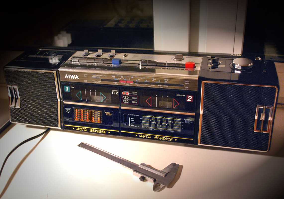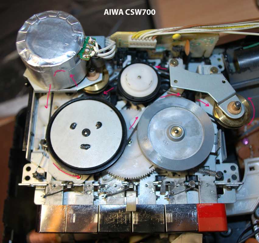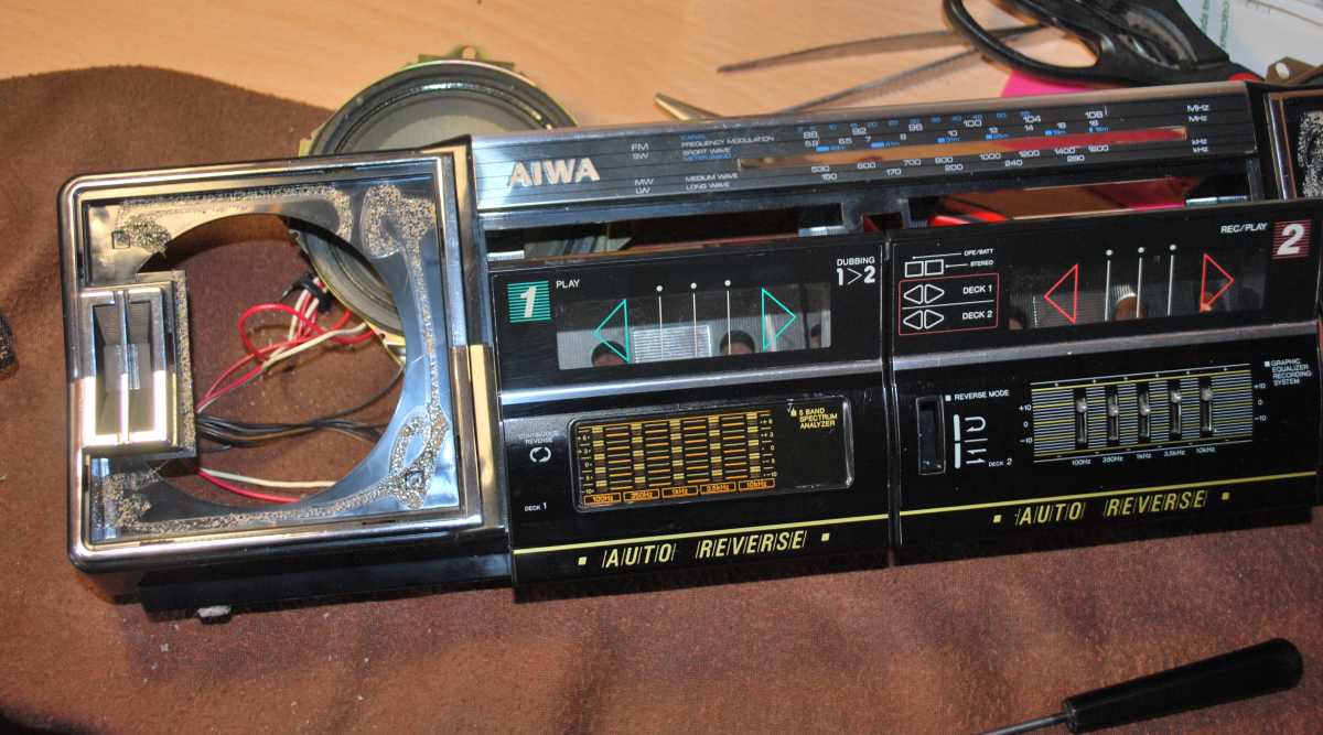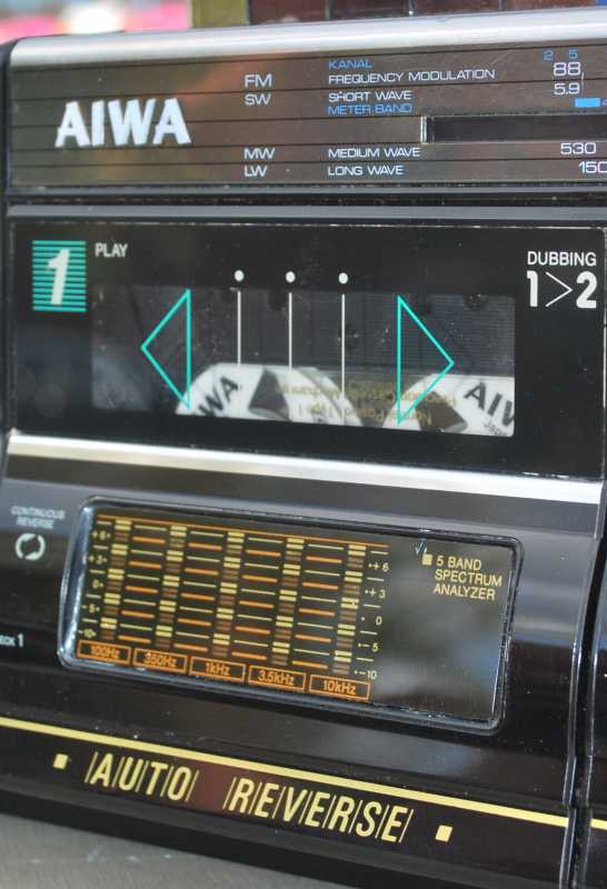 Честно скажу как на духу. Больше никогда в жизни не куплю ни одного батона. Попросту потеряло смысл. Это двухкассетная королева всех батонов. Если мне предложат JVC M90, наверно я пошлю нахер. Давно не был в таком парасячьем восторге. Малявка, малявкой с 5 полосным спектроанализатором на одном кармане, с эквалайзером на втором, на обоих карманах реверс - на правом с поворотной головизной. На левом большая полноразмерная головка. Полноценный AUX под мобильник через провод. Звук... одним словом AIWA. Для рынка Японии выпускалась под индексом CSW70 и вместо 15светодиодов анализатора будильник, что бы дети школу не проспали. Я не уверен что эта магнитола выпускалась только как мой экземпляр, в лимонном Сингапуре. Возможно и в самой Японии под два диапазона приемника. Выпускалась еще в белом исполнении. Много хрома и алюминия. У моей магнитолы предстоит заменить паралон на грилях и пассик немного тянет. Очень громкий малявка, у которого в документах скромно заявлены только 5х5=10W. Размеры 520x145x130мм Интересная опция Automatic loudness. Что-то я такого как-то и не припомню. 4,1 кг веса без 8 батареек. Однозначно один ярких из шедевров мирового магнитолостроения. Разделка тушки AIWA CSW700. Снимаются колпачки трех тумблеров, крути-ка настройки, де крутилки - громкости и переключателя диапазонов. Выкручиваются 7 саморезов длинной 30мм. Открываю. Крышка соединена с основным шасси 3 разъемами. На каждой ЛПМ по собственному мотору. Для того что бы добраться до левого ЛПМ нужно открутить всего два самореза розового цвета. И немного отогнуть пластиковую планку шкалы радиоприемника. Снимать ее совсем - себе дороже. Пассики квадратного сечения. На левой деке с поворотной головой - 11см длинны. Жив, хороший натяг, но усилия не хватает для поворота головы. Поставил усиленный от видика. Пассики со Ждановичей совсем сопливые, тоньше оригинала на полмиллиметра. Cмазал везде где есть металл. Пришлось повозиться. Поставил вместо хлипкого, потолще - 2мм, от видика. Изменилась скорость кассеты, а на моторе она не регулируется. Поставил другой - тонкий. Все крутило, работало, пока не случился попандос. А именно, подкассетник "съел" кассету и не отдаёт. Каретка ЛПМ с поворотной головкой ушла вниз в паз кассеты и назад не возвращается - не хватает зацепа пасека что бы вернуть в исходное положение. Пришлось разобрать магнитолу. И так и сяк, не открыть. Ну, думаю, как казахи говорят, кирдык. Потом придумал: полез в подкассетник старым советским столовым ножом и приподнял каретку принудительно. Подкассетник кассету выпусил и открылся. Пришлось снова поставить пассик от видика как более мощный для работы в автореверсе. Пока постоит, найду со временем пожиже 11сантиметровый. Второй лентопротяжке повезло не меньше. На ней пассик начал плавиться и порвался. Еще год бы магнитола простояла и превратился бы совсем в смолу. Её и снять посложнее - мешает столбик шкалы приемника. Лентопротяги отличаются первый от второго конструкционно. Поскольку пассик самоуничтожился, пришлось придумать способ мгновенной очистки. Раньше я по полчаса возился со спиртом, ватными палочками и ветошью. Сейчас потратил на чистку минуты две. Берется клубок шерстяных ниток, отрезается толстая нить длинной сантиметров двадцать. Опускается в спирт. Смоченной в спирте нитью несколькими скользящими движениями, намотав на грязный махо