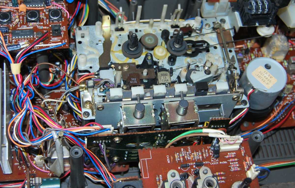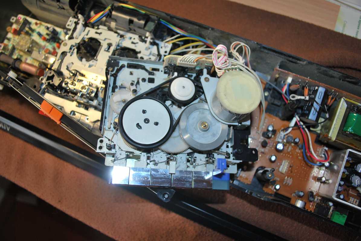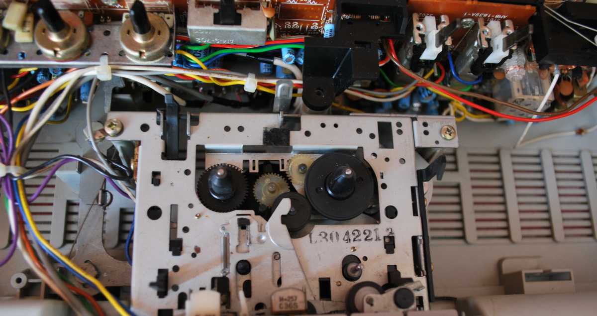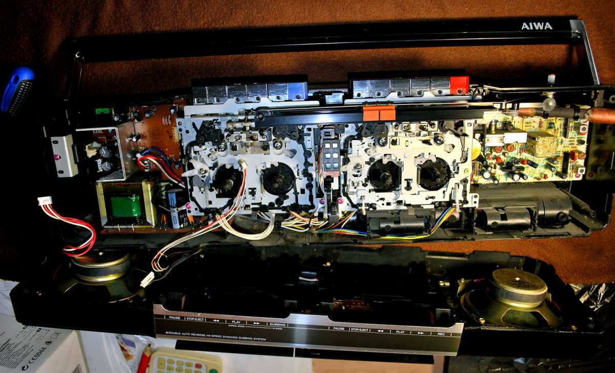 Честно скажу как на духу. Больше никогда в жизни не куплю ни одного батона. Попросту потеряло смысл. Это двухкассетная королева всех батонов. Если мне предложат JVC M90, наверно я пошлю нахер. Давно не был в таком парасячьем восторге. Малявка, малявкой с 5 полосным спектроанализатором на одном кармане, с эквалайзером на втором, на обоих карманах реверс - на правом с поворотной головизной. На левом большая полноразмерная головка. Полноценный AUX под мобильник через провод. Звук... одним словом AIWA. Для рынка Японии выпускалась под индексом CSW70 и вместо 15светодиодов анализатора будильник, что бы дети школу не проспали. Я не уверен что эта магнитола выпускалась только как мой экземпляр, в лимонном Сингапуре. Возможно и в самой Японии под два диапазона приемника. Выпускалась еще в белом исполнении. Много хрома и алюминия. У моей магнитолы предстоит заменить паралон на грилях и пассик немного тянет. Очень громкий малявка, у которого в документах скромно заявлены только 5х5=10W. Размеры 520x145x130мм Интересная опция Automatic loudness. Что-то я такого как-то и не припомню. 4,1 кг веса без 8 батареек. Однозначно один ярких из шедевров мирового магнитолостроения. Разделка тушки AIWA CSW700. Снимаются колпачки трех тумблеров, крути-ка настройки, де крутилки - громкости и переключателя диапазонов. Выкручиваются 7 саморезов длинной 30мм. Открываю. Крышка соединена с основным шасси 3 разъемами. На каждой ЛПМ по собственному мотору. Для того что бы добраться до левого ЛПМ нужно открутить всего два самореза розового цвета. И немного отогнуть пластиковую планку шкалы радиоприемника. Снимать ее совсем - себе дороже. Пассики квадратного сечения. На левой деке с поворотной головой - 11см длинны. Жив, хороший натяг, но усилия не хватает для поворота головы. Поставил усиленный от видика. Пассики со Ждановичей совсем сопливые, тоньше оригинала на полмиллиметра. Cмазал везде где есть металл. Пришлось повозиться. Поставил вместо хлипкого, потолще - 2мм, от видика. Изменилась скорость кассеты, а на моторе она не регулируется. Поставил другой - тонкий. Все крутило, работало, пока не случился попандос. А именно, подкассетник "съел" кассету и не отдаёт. Каретка ЛПМ с поворотной головкой ушла вниз в паз кассеты и назад не возвращается - не хватает зацепа пасека что бы вернуть в исходное положение. Пришлось разобрать магнитолу. И так и сяк, не открыть. Ну, думаю, как казахи говорят, кирдык. Потом придумал: полез в подкассетник старым советским столовым ножом и приподнял каретку принудительно. Подкассетник кассету выпусил и открылся. Пришлось снова поставить пассик от видика как более мощный для работы в автореверсе. Пока постоит, найду со временем пожиже 11сантиметровый. Второй лентопротяжке повезло не меньше. На ней пассик начал плавиться и порвался. Еще год бы магнитола простояла и превратился бы совсем в смолу. Её и снять посложнее - мешает столбик шкалы приемника. Лентопротяги отличаются первый от второго конструкционно. Поскольку пассик самоуничтожился, пришлось придумать способ мгновенной очистки. Раньше я по полчаса возился со спиртом, ватными палочками и ветошью. Сейчас потратил на чистку минуты две. Берется клубок шерстяных ниток, отрезается толстая нить длинной сантиметров двадцать. Опускается в спирт. Смоченной в спирте нитью несколькими скользящими движениями, намотав на грязный махо