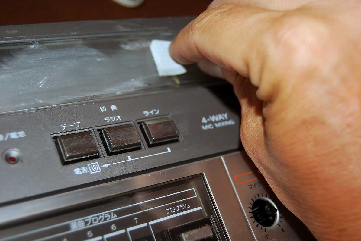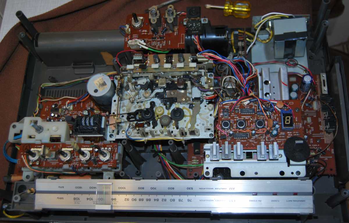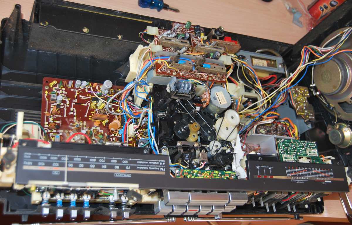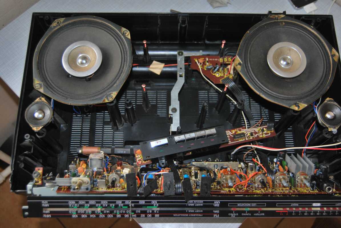 Аппаратик приехал из Японии, приезенный руками контрабандистов, пароходом через Сахалин. К сожалению такие финты в доставке больше мне не доступны. Понятное дело что аппарат 40 лет пережил. Грязнущий! Стекло шкалы приемника в царапинах. Хромированные ручки все окислились и приобрели цвет плесени сыра Дор Блю. Принес домой. Подключил к блоку питания 12V. Магнитола ожила сразу всеми своими функциями. Приемник вцепился в "Юмор FM" и динамики дунули густым саундом 80-х. Кассетная часть тоже порадовала - не надо китайские пассики вставлять. Вот только счетчик молчит. Естественно, первое, это то что глаз режет - косметика! Поснимал все хромированные ручки к нопки. Зубная щетка. Украинский "силит", любую ржавчину осилит, но тот, который для хромированных кранов на кухне и в ванне! Я его уже многократно использовал а к химии стараюсь относиться очень осторожно. Отчистил. Смыл водой и потом протер эвкалиптовой полиролью. Сразу все элементы засверкали как яйца у кота, из жидкой ртути. На картинках - предшествующие масштабы бедствия! После промывки поверхностей, все кнопки вернулись на место. Но под слоем грязи скрывался бриллиант! Но больше всего резала глаз шкала приемника. Обычно я долго вожусь, а тут справился минут за пять. Знакомый автомаляр презентовал мелкодисперсную наждаку на основе пористой мягкой губки. Затер проблемные места. Далее в ход пошло, чем богаты. Оргстекло шлифуют всем, кто на что горазд. Если всё хреново- меняют нафиг. Этой магнитоле повезло. Трещин нет. Полирнул крокусом для шлифовки оптики. Слегка намочил обычный кусок х/б от старой наволочки. Макнул в розовый порошок крокуса. Пара минут. Стекло как новое. Пару дней магнитола усердно работала на подоконнике в качестве радио. Шуршит и постреливает регулировка громкости. Следующий этап - разборка и числа аппарата внутри. Сегодня полезу ковыряться с отверткой. Аппарат - огонь! Особенно в звуке. Я даже не ожидал. Только был куплен без крышки батарейного отсека. Взял такую же у Sergtheseal от этой же модели и заказал 3D копию. К концу недели будет готова. Скоро обзор потрохов RX-5400 и его фотосессия. Ах да, магнитола для рынка страны Восходящего Солнца. Скоро будет и перевод всех надписей. Впереди - мелкое обслуживание внутри. Пропотрошение! Всего 7 винтов! Но каких! Цаца. Я задолбался с кучей крестообразных отверток, которые то цепляют крест то нет. Винты для National я как-то раньше такие не встречал. Они с шляпкой и под + и под -! Удобно. Магнитола девственная. Никто до меня там не пасся, винты закручены были крепко и открутились только тем самым минусом. Снимаются отщелкивающияся крышка подкассетника и абсолютно все крутилки и 4 ручки переключателей. Открываю! Тадам! Привод бегунка радиоприемника - зубчатый ремень! Пластик ремешка не абы какой а прямо что-то типа кевлара, или что либо другое как мне показалось. Неэластичный. Лет 200 не рассыпется. На дворе олимпийский 1980-й год. Ныряем дальше. Отстегивается лицевая панель с динамиками внутри, которые к основной плате подсоединяются разъемом. Удобно. Технологично. Не то что в айвах. Но в кое чём технологи схалтурили. Твиттеры не открутить! А какой чудесный съемный трансформатор. Меняй - не хочу! Два болта открутил. Два провода на 100 вольт. Два ... м-м-м 10V??? Вроде так если следовать маркировке. Следующий раз измеряю. Пассик я не вижу смысла менять если и так все 