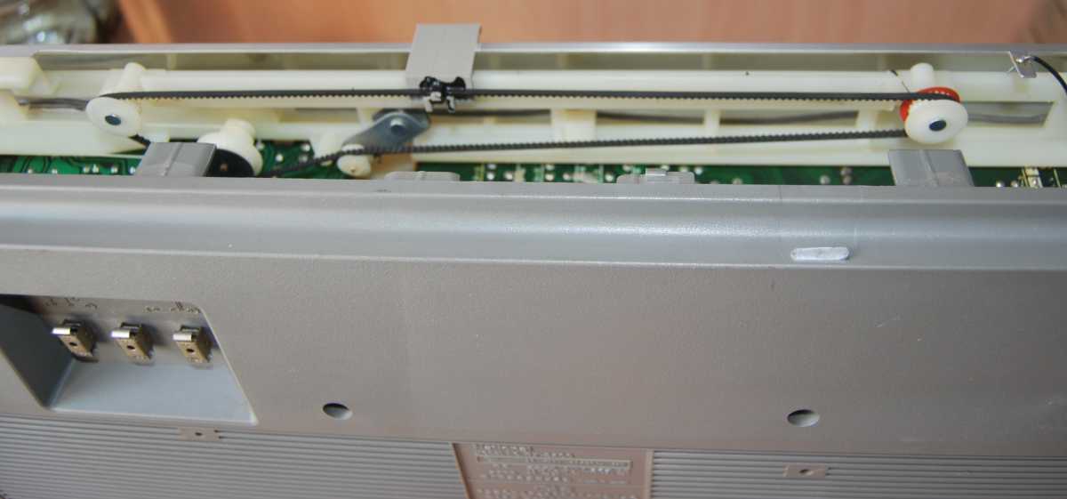Этот япошка приехал ко мне с Сахалина. Эдакий студент по обмену. Красивый. Почти как новый. С черной шкалой. 100 вольт трансформатор. Я обычно всегда старался в островные модели транс вмонать на 220, а тут был в Одессе, и на старомодном рынке накупил нужной полярности японских блоков питания. И решил пока до следующего лета на этом остановиться. В общем передо мной некошеный японский шарп. Тут же вспомнился его аналог GF-9696, который мне из Могилева приехал. Усмоктанный, кофе облитый, ободран в хлам. Верхнюю шкалу пришлось перекрашивать и наносить все надписи по новой. Ну и видимо в том шаре и до меня кто-то покапался. В этом, смотрю невиданный для меня дополнительные прокладочки из паралона. Не паханное поле оказалось с некоторыми камушками. Например, смотрю, ферритовая планка приемника вообще болтается на одних проводах. Видимо, от старости лопнула одна из стоек крепления. Их там две. Осторожно установил ее на живую, а вопрос со второй решит капля дорогой эпоксидки. Я конечно перфекционист, но где найду вторую. Мотор молчал изначально как вкопанный. Открутить винты впервые за 39 лет - пытка еще та. Несколько крестообразных отверток просто не в состоянии были это сделать. Винты взяли только после обычной плоской, заточенной на алмазном кругу советской отверткой. Позор Китаю. Хреновый у них инструмент! Мотор молчал по банальной причине. Пассик прилип к валу и на маховик слновно вклеенный. Осторожно отцепился, но я намерен его помыть и туда же поставить другой стороной. Не доверяю я новоделам. Лентопротяжка не сложная. Там даже есть кнопка концевого выключателя, от чего я был в особом восторге, а не жидкие пластиночки контактов! Отдельная история с прижимным пассиком. В этом аппарате все затеи с нипелями и капельницами потерпели провал. Пришлось взять электродрель и выливать прижимной ролик из куска круглой резины, нанизанный на сверло. Пока туда сюда колдовал с вариантами прижимного ролика, оказалось что завальцованую медную втулку можно еще и вынуть и не мучится с зубочистками, как пишут интернете. Да и чистить камеру старого ролика от грязи с помощью спирта удалось практически мгновенно. Общение с этой магнитолой у меня состоялось лет 6 назад, когда мне в руки попал европейский брат этого аппарата GF-9696. Не смотря на ужасное состояние, возня с резиной мне как-то там легче далась. А с японцем я провозился как-то дольше. Так что опыт - вещь относительная. В данном случае с 508-м столкнулся еще и с отсутствием пассиков. Попробовал найти нужный размер 130см х 4мм. Куда та-ам! Не нашел в Беларуси. Все что угодно, но только не это. Зато у меня оказался такого размера, но 5мм шириной. Пришлось резать канцелярским ножом на включенном двигателе. Потом развернул на ЛПМ таким образом, что-бы ровная часть касалась краев лентопротяжки и не детонировала. Подумал что видимо немного не то. Потом нашел 130мм но 3см. Поставил... пассив свалился в паз и скорость крепко возраста. Поставил "резной" вариант. Получилось лучше. В общем, пока стоит такой, немного калека бо играет вполне сносно. Но в поиске родного варианта. Сравном два аппарата GF508 и GF9696. Последний звонче. Стал крутить, у японки оказалось что резистор на лицевой панели нужно просто-напросто почистить. Почистил - оба играют примерно одинаково, хоть и два разных аппарата. Но, как ни крути, косметика япошки на высоте. Ост