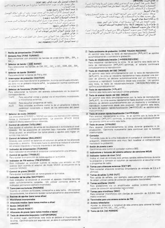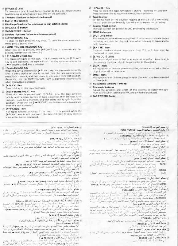 Выход : PHONO вход терминалы (PIN гнезда), заземление , AUX Jack (3,5 мм мини-джек), внешний микрофон ( ) левый Jack (3,5 мм мини-джек), удаленный терминал (2,5 мм мини-джек), функция cмешивания MUTE, гнездо для микрофона (3,5 мм мини-джек), гнездо для внешнего динамика (левый, 4 Ω, миниджек 3,5 мм), разъем для наушников (стандартный Джек 6,3 мм). От мини-штекер в aux aux на ЛЕНТЕ, переход на статус записи функции.