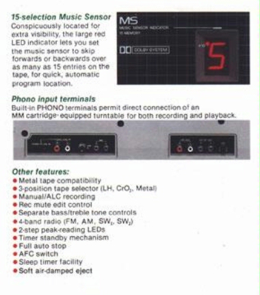 Записывать музыку на SHARP GF-6464 на кассету было ужасно из-за автоматического уровня записи. Зато с микрофона это чудо запросто записывало все что угодно. Один раз записался случайный разговор с абонентом из трубки находившегося в соседнем коридоре, телефона.