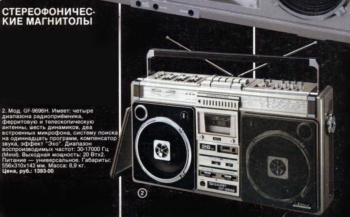 Как сейчас помню, глаза зацепились за SHARP-5454, которые были серебристого и кофейного цветов и стоили от 900 до 1200 советских рублей. Двухкассетники тогда только появились. Выглядели ужасно и стоили несусветных денег.