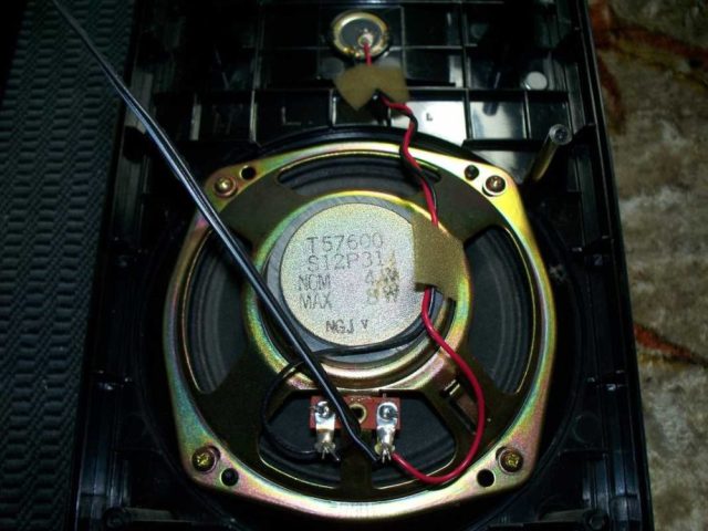 Перейдём к источнику звука, а точнее колонки, они отстёгиваются, сделаны из пластмассы, внутри никакого наполнителя, только распорки. Нч динамик 12см, Вч как у многих аппаратов пьезо.