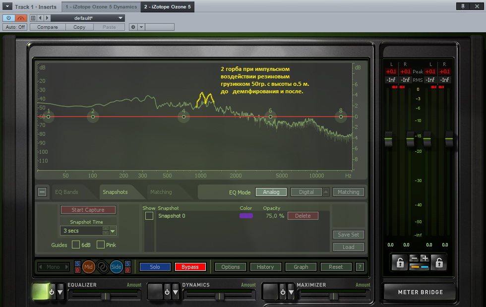 К сожалению самые первые замеры пропали вместе с памятью компьютера... остается только поверить на слово и проанализировать по памяти восстановленный скриншот.По ощущениям... пропал звон от простукивания, появилась глухота поглощающая призвук.