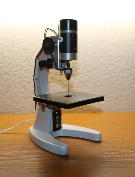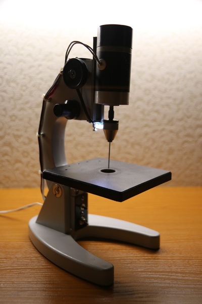 Технология сборки видна из приведенных выше фотографий. Добавлю только, что в качестве подсветки применил светодиод с большим углом раскрытия и всю коммутацию разместил внутри микроскопной станины.Биения практически нет...максимум, 2-3 десятки. Отверстия до 3мм сверлит отлично. Рабочая зона, освещается равномерно.