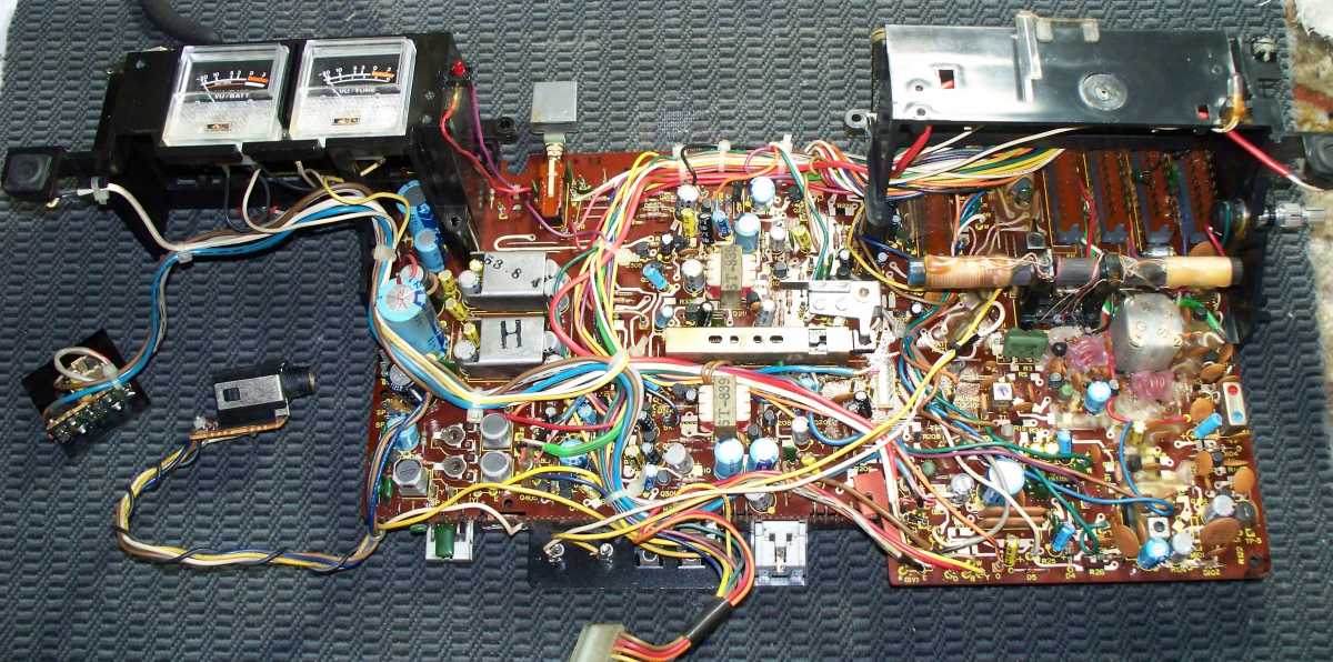 Ну а сейчас нужно немного поработать паяльником. Дело в том, что приёмник в этом аппарате был перестроен под УКВ диапазон. После изучения имеющихся у меня фото шарпов этой сери, пришёл к выводу, что вернуть диапазон на место не составит труда. Потом выпаял контура с тремя витками медной проволоки, намотал новые, но уже с двумя витками, и припаял их обратно на место. Манипулирую сжатием витков контуров ,вложил все станции в нужный диапазон. Теперь приёмник работает в FM, и без проблем принимает FM стерео. Ну и залил всё это парафином.