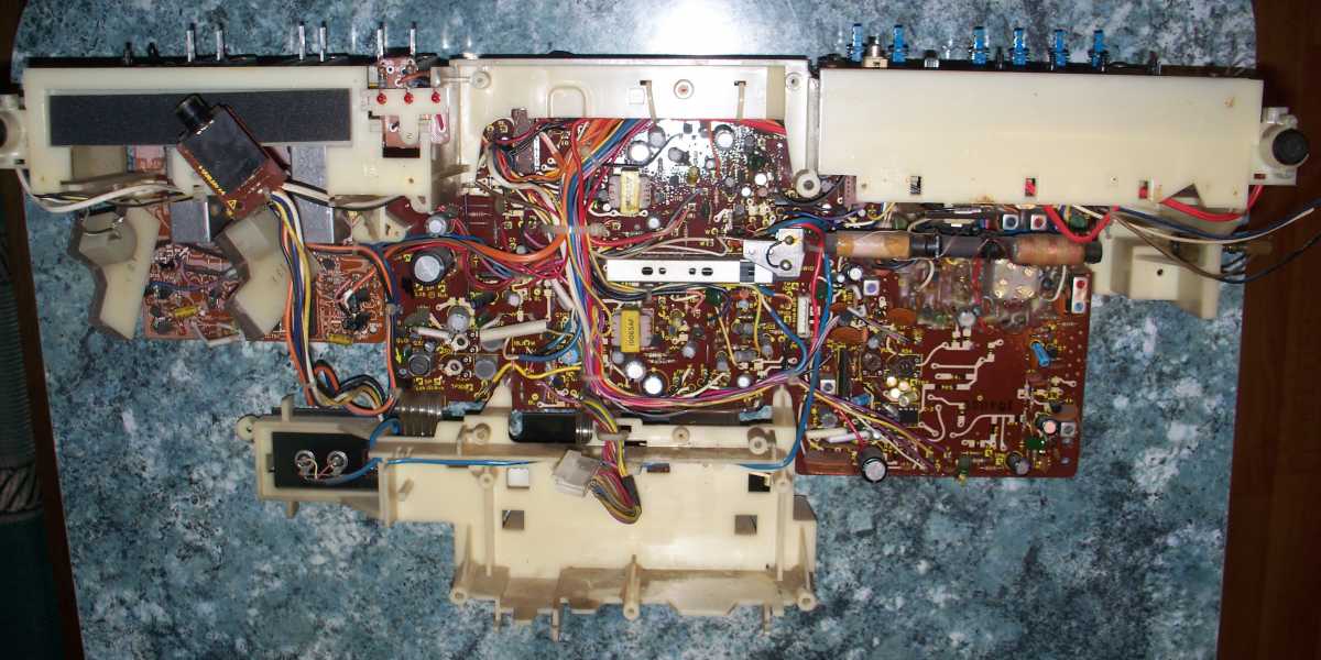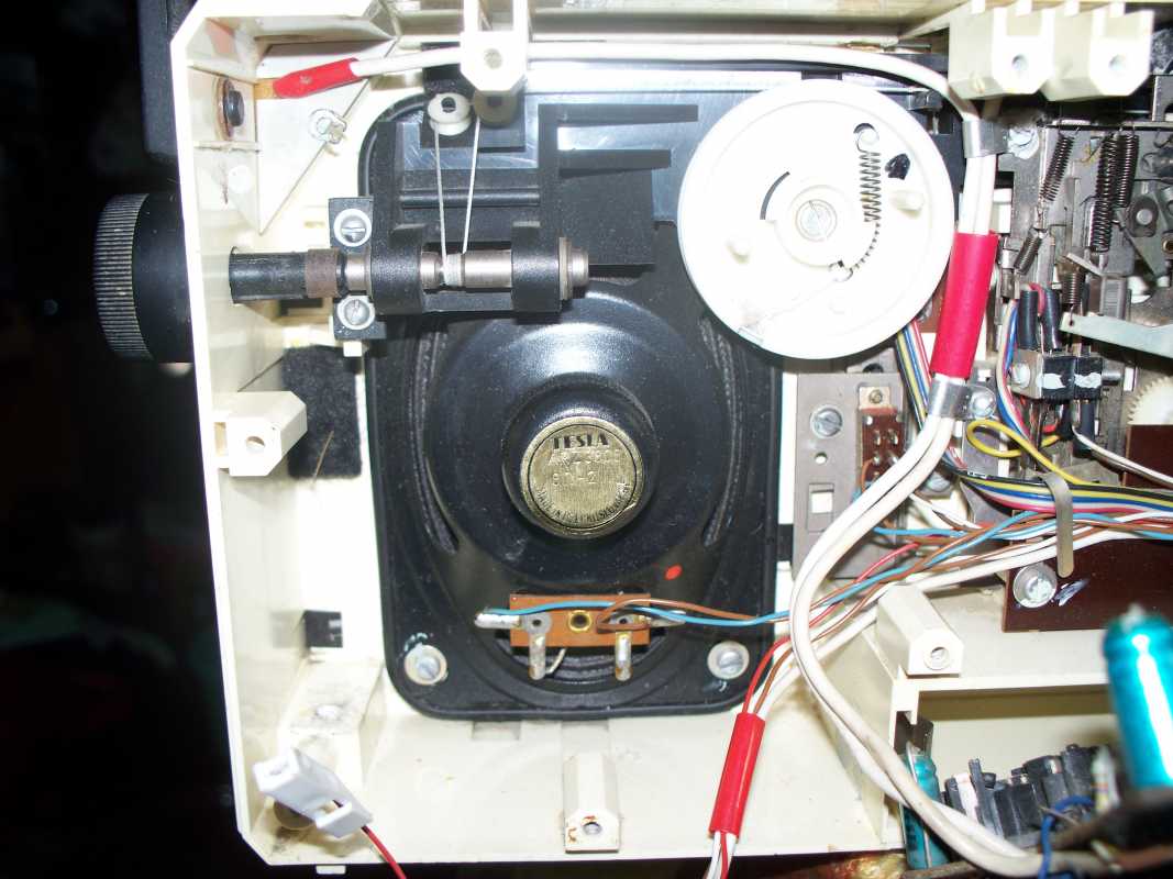 Как и все Шарпы разбирается он очень просто. Сзади выкручиваются винты, и снимается лицевая часть с динамиками. Динамики Шарповские, применяются во многих аппаратах этой марки, диаметром 16см, белого цвета.