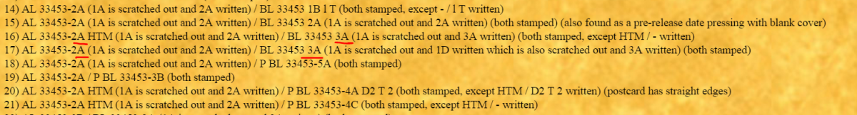 15) AL 33453-2A (1A is scratched out and 2A written) / BL 33453 2A (1A is scratched out and 2A written) (both stamped) (also found as a pre-release date pressing with blank cover)