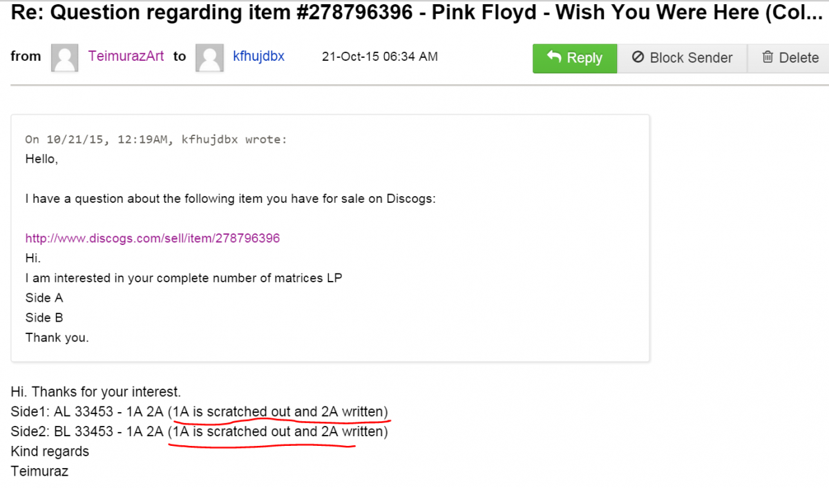 Если я туплю то прошу прощения, но ссылки я дал с теми номерами матриц, что были указаны. Посмотрите по ссылке ниже в разделе Barcode and Other Identifiers.Или вы хотите сказать, что у каждой пластинки есть серийные номера?