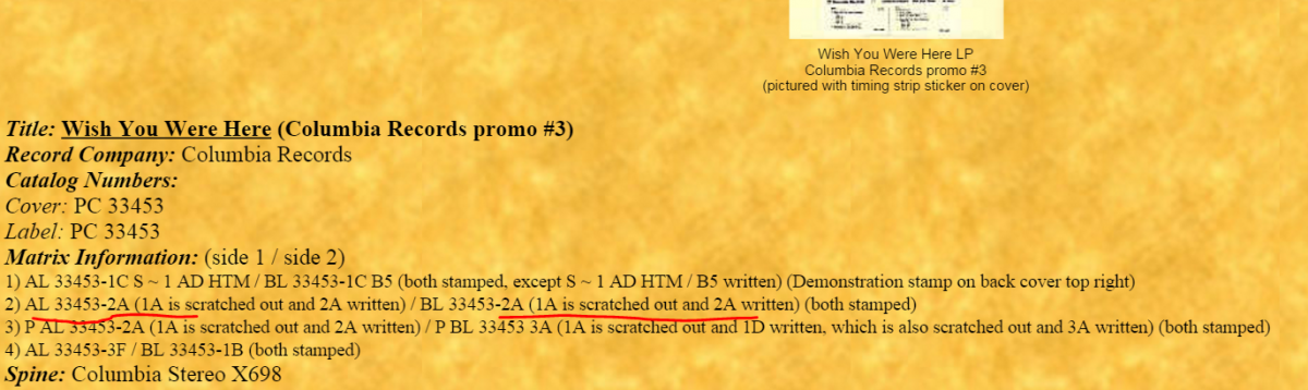 Mispressing: A mispressing was made with Bob Dylan's Street Legal on side A, and Pink Floyd's Wish You Were Here on side B. Matrix: AL 35453-10 (stamped) 15 A o (written) / BL 33453-10 (stamped) 15 (written).