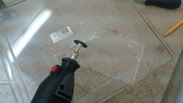 Тонированного пластика под рукой нету, выбрал прозрачный от офисной подставки для бумаг. Прочный пластик, достаточная толщина. Зато видно будет, сколько кассеты осталось:)
