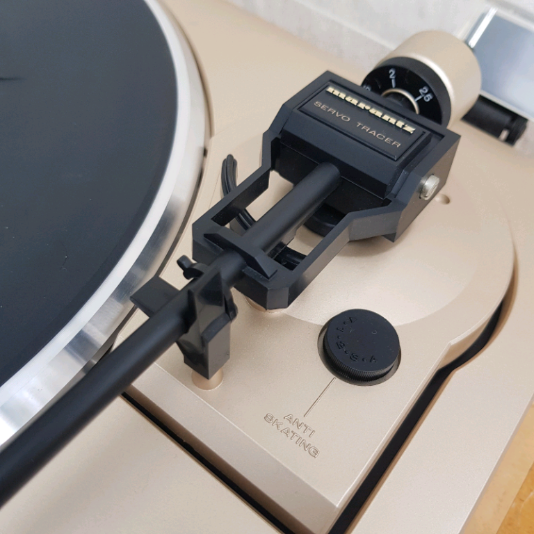 Фирменные светло-бронзовые цвета бренда Marantz. Красивая, элитная вертушка, которая и интерьер украсит, и виниловодов удивит и отиграет все что угодно. Регулировка антискейтинга выполнена весьма необычно.